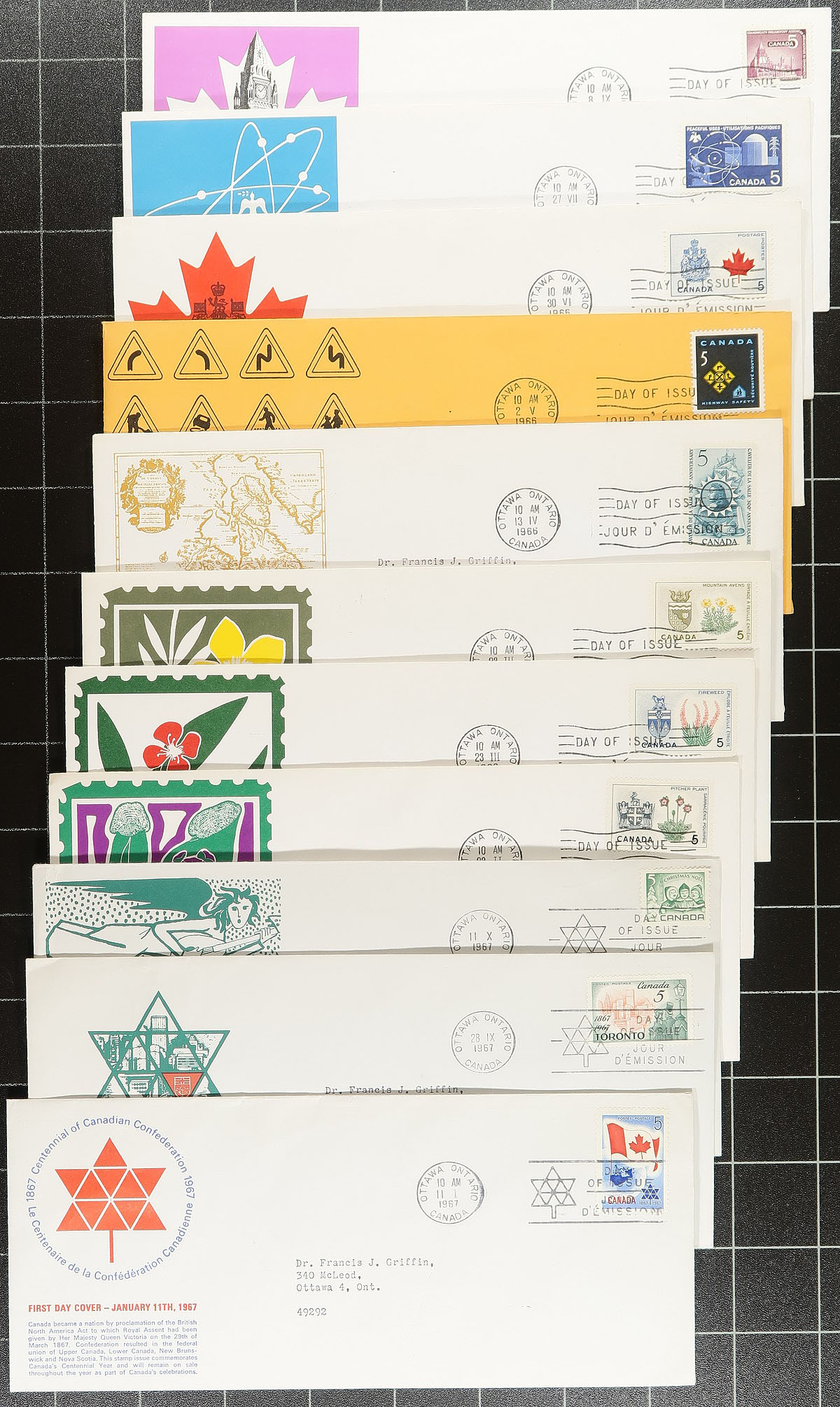 First Day Covers. Holding of 63x "Pharmaceutical" First Day Cover holding 1957-1973 (but primarily from the late 1960's / early 1970's), with private cachets produced or specially produced for either Schering or Elliot-Marion (EM). Condition is fair overall, with almost all still having the original info "stuffer" inside. Estimate =