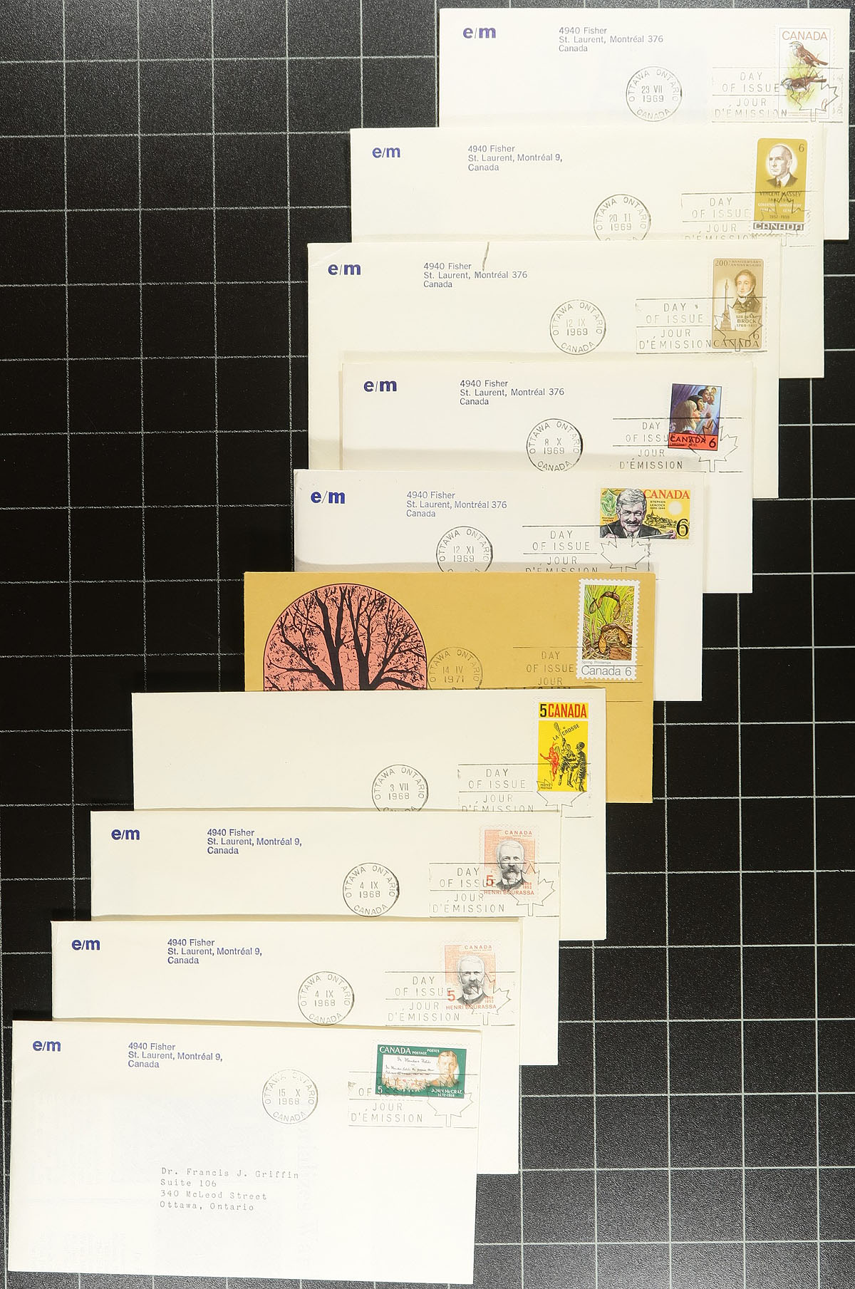 First Day Covers. Holding of 63x "Pharmaceutical" First Day Cover holding 1957-1973 (but primarily from the late 1960's / early 1970's), with private cachets produced or specially produced for either Schering or Elliot-Marion (EM). Condition is fair overall, with almost all still having the original info "stuffer" inside. Estimate =