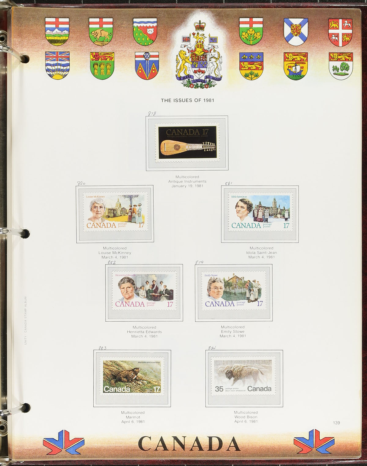 Unity Stamp Albums Collection. A duo of padded binder, illustrated pages Unity albums, with pages for 1851-1993 plus "Back of the Book" A bit sparsely filled in the front, but did notice a few Small Queens / Map Stamps followed by a smattering of used before transitioning to mostly mint mounted on the pages. Conservatively valued for the usable postage / face value alone, but take into consideration there is a good amount of used, plus two better albums (which would likely retail $150.00 alone). Total face value =