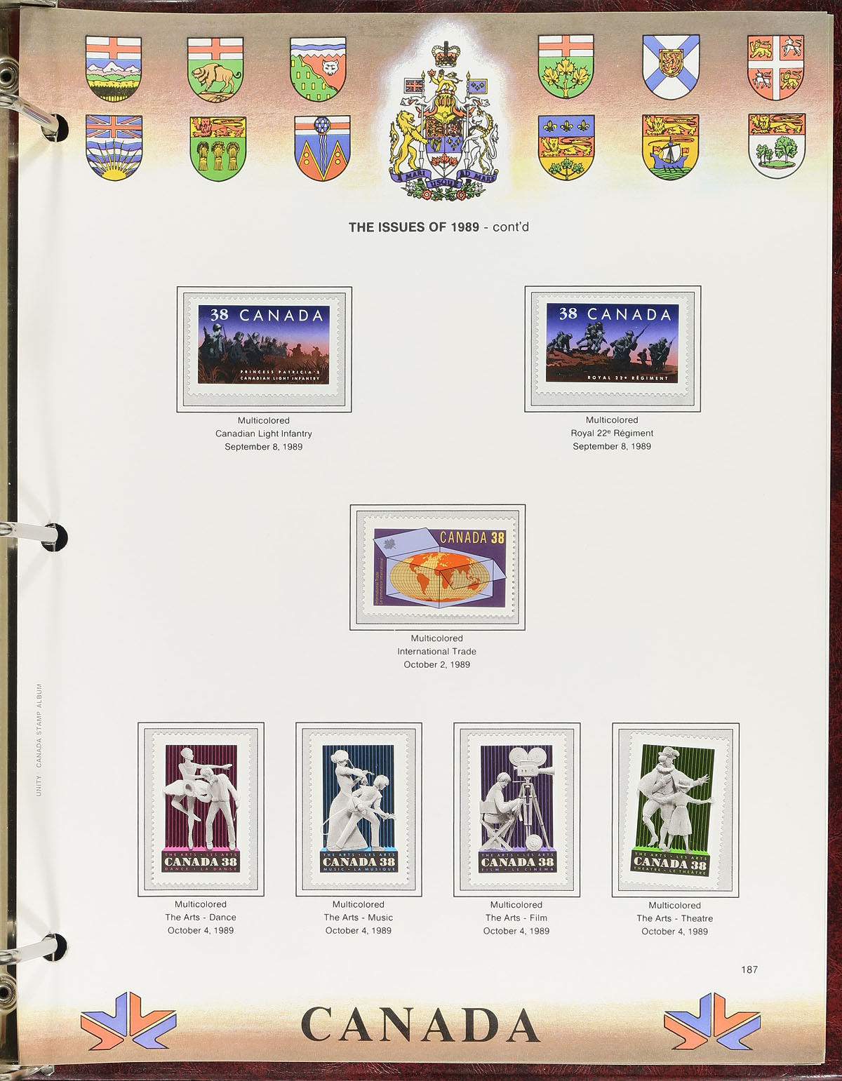 Unity Stamp Albums Collection. A duo of padded binder, illustrated pages Unity albums, with pages for 1851-1993 plus "Back of the Book" A bit sparsely filled in the front, but did notice a few Small Queens / Map Stamps followed by a smattering of used before transitioning to mostly mint mounted on the pages. Conservatively valued for the usable postage / face value alone, but take into consideration there is a good amount of used, plus two better albums (which would likely retail $150.00 alone). Total face value =