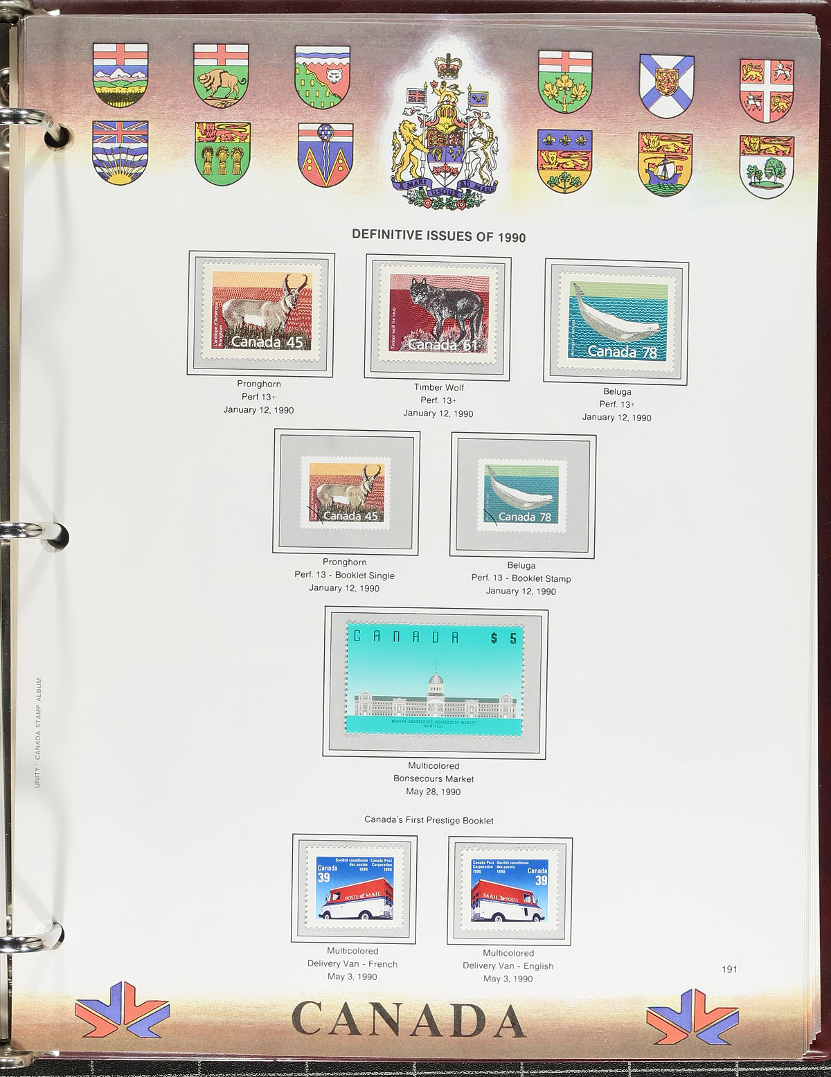 Unity Stamp Albums Collection. A duo of padded binder, illustrated pages Unity albums, with pages for 1851-1993 plus "Back of the Book" A bit sparsely filled in the front, but did notice a few Small Queens / Map Stamps followed by a smattering of used before transitioning to mostly mint mounted on the pages. Conservatively valued for the usable postage / face value alone, but take into consideration there is a good amount of used, plus two better albums (which would likely retail $150.00 alone). Total face value =