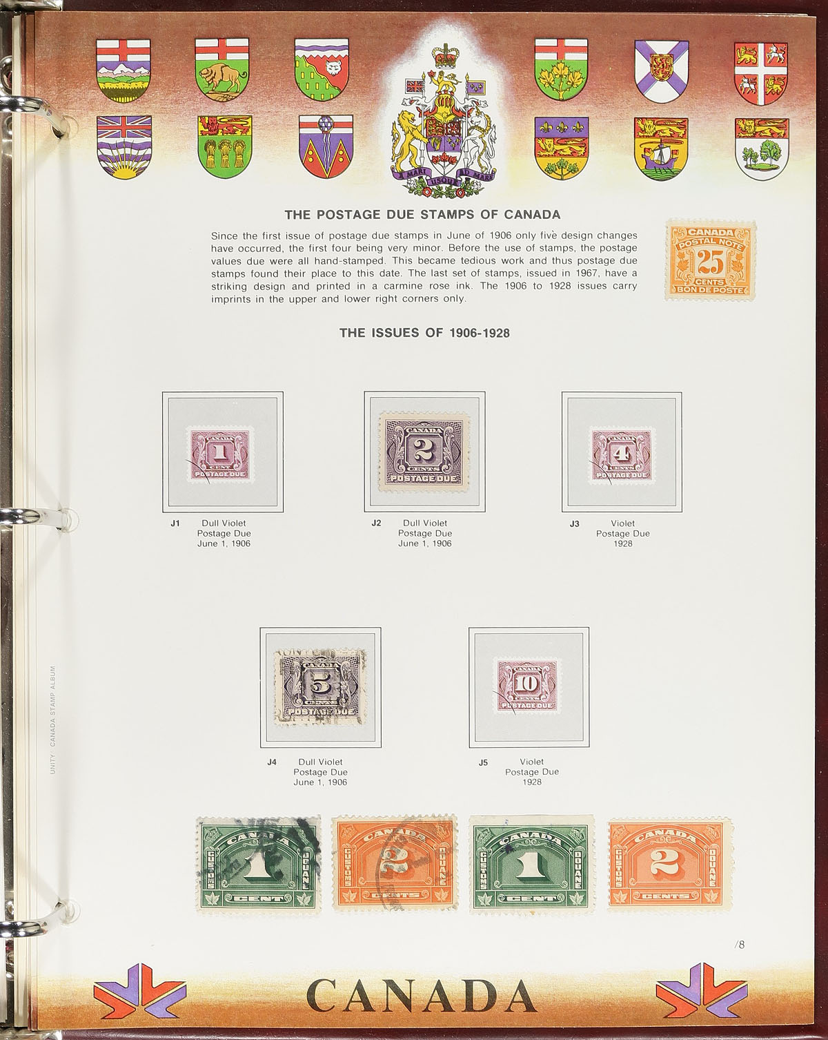 Unity Stamp Albums Collection. A duo of padded binder, illustrated pages Unity albums, with pages for 1851-1993 plus "Back of the Book" A bit sparsely filled in the front, but did notice a few Small Queens / Map Stamps followed by a smattering of used before transitioning to mostly mint mounted on the pages. Conservatively valued for the usable postage / face value alone, but take into consideration there is a good amount of used, plus two better albums (which would likely retail $150.00 alone). Total face value =