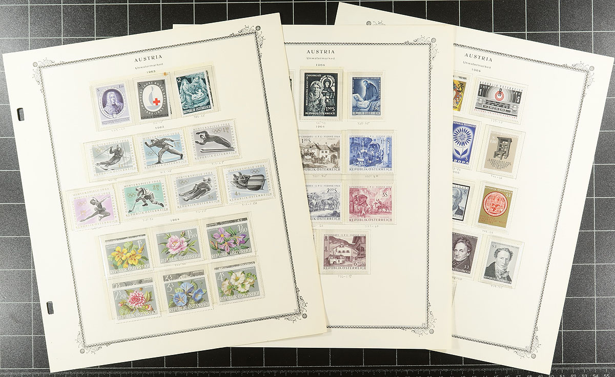 Nice collection of primarily never hinged Austria, 1920's-2001, containing many hundreds of stamps, neatly organized in mostly hingeless album pages and a few stock pages. The collection generally ranges from Scott #303/1843, noting primarily sets, a few souvenir sheets, and back of the book issues. Owner's older Scott catalogue value for the lot totals US$739.00, leaving better finds for the determined collector. A nice clean lot with photos showing an overview. Estimate =