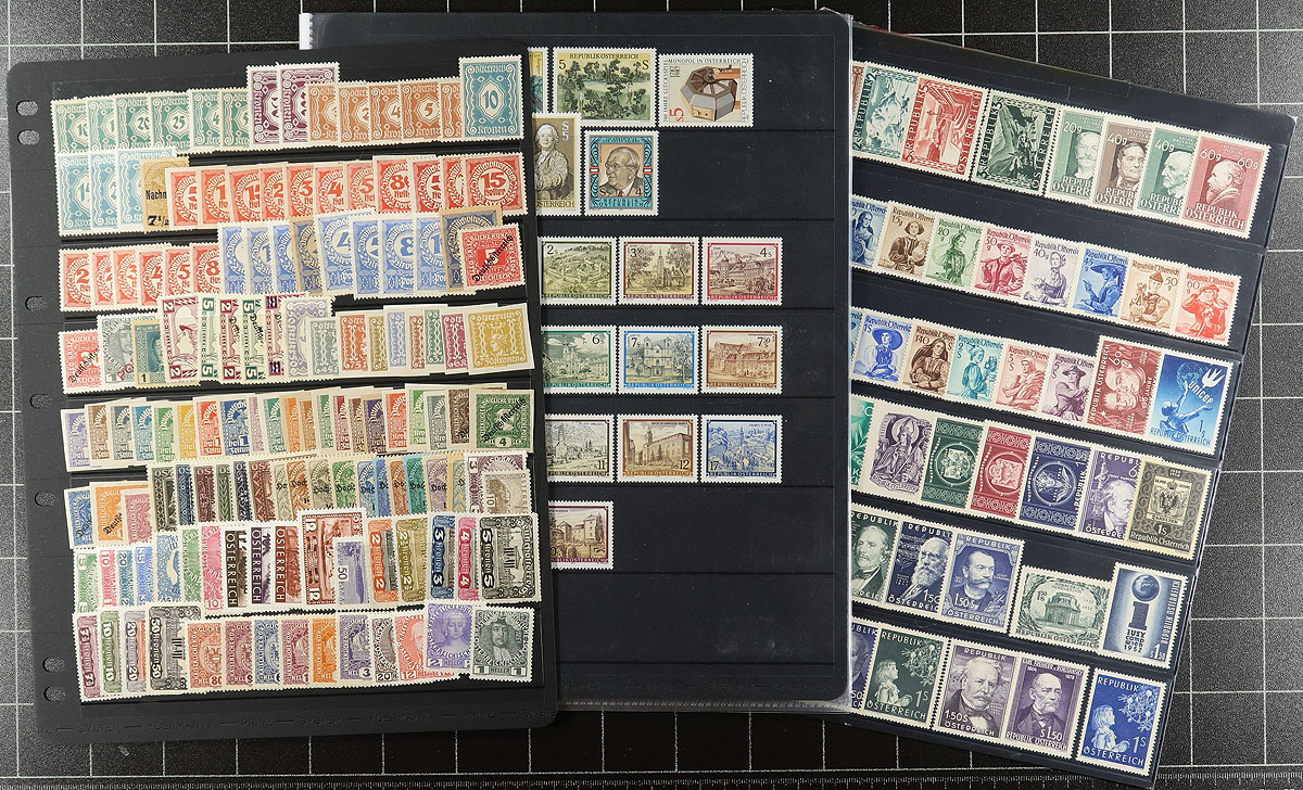 Nice collection of primarily never hinged Austria, 1920's-2001, containing many hundreds of stamps, neatly organized in mostly hingeless album pages and a few stock pages. The collection generally ranges from Scott #303/1843, noting primarily sets, a few souvenir sheets, and back of the book issues. Owner's older Scott catalogue value for the lot totals US$739.00, leaving better finds for the determined collector. A nice clean lot with photos showing an overview. Estimate =