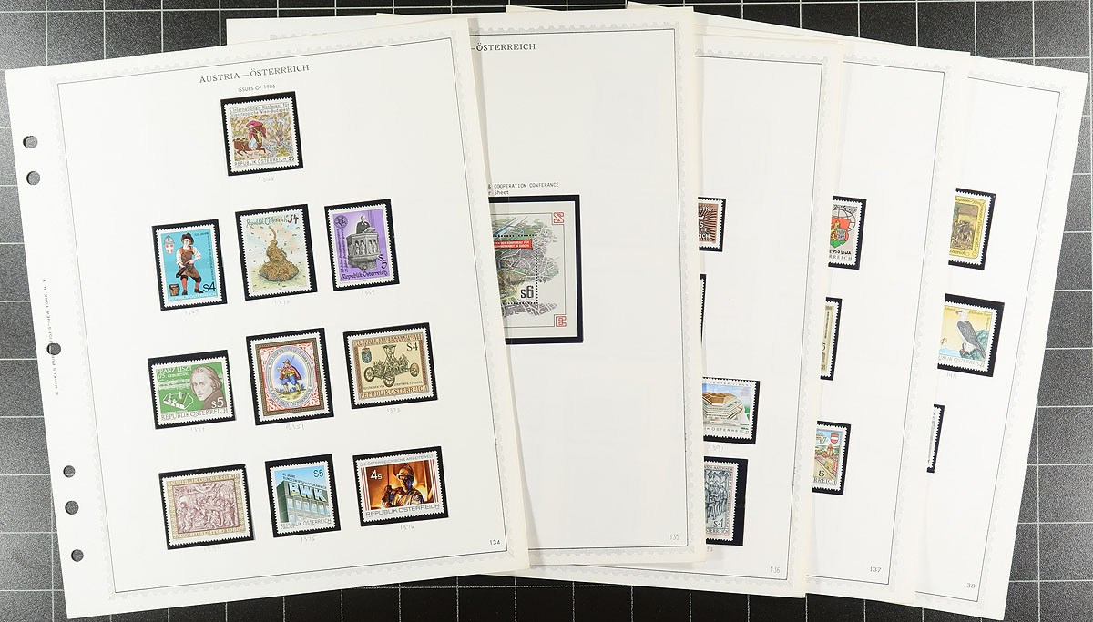 Nice collection of primarily never hinged Austria, 1920's-2001, containing many hundreds of stamps, neatly organized in mostly hingeless album pages and a few stock pages. The collection generally ranges from Scott #303/1843, noting primarily sets, a few souvenir sheets, and back of the book issues. Owner's older Scott catalogue value for the lot totals US$739.00, leaving better finds for the determined collector. A nice clean lot with photos showing an overview. Estimate =