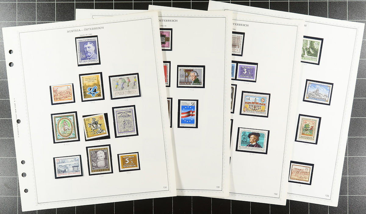 Nice collection of primarily never hinged Austria, 1920's-2001, containing many hundreds of stamps, neatly organized in mostly hingeless album pages and a few stock pages. The collection generally ranges from Scott #303/1843, noting primarily sets, a few souvenir sheets, and back of the book issues. Owner's older Scott catalogue value for the lot totals US$739.00, leaving better finds for the determined collector. A nice clean lot with photos showing an overview. Estimate =