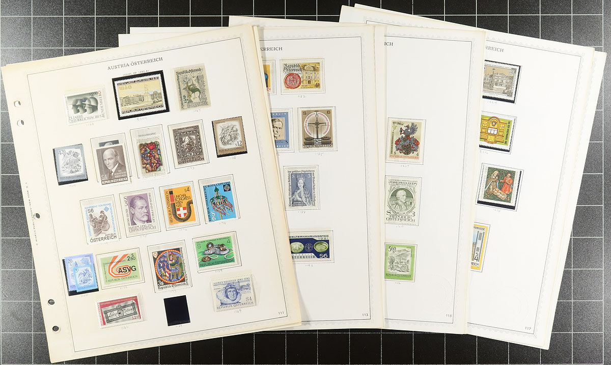 Nice collection of primarily never hinged Austria, 1920's-2001, containing many hundreds of stamps, neatly organized in mostly hingeless album pages and a few stock pages. The collection generally ranges from Scott #303/1843, noting primarily sets, a few souvenir sheets, and back of the book issues. Owner's older Scott catalogue value for the lot totals US$739.00, leaving better finds for the determined collector. A nice clean lot with photos showing an overview. Estimate =