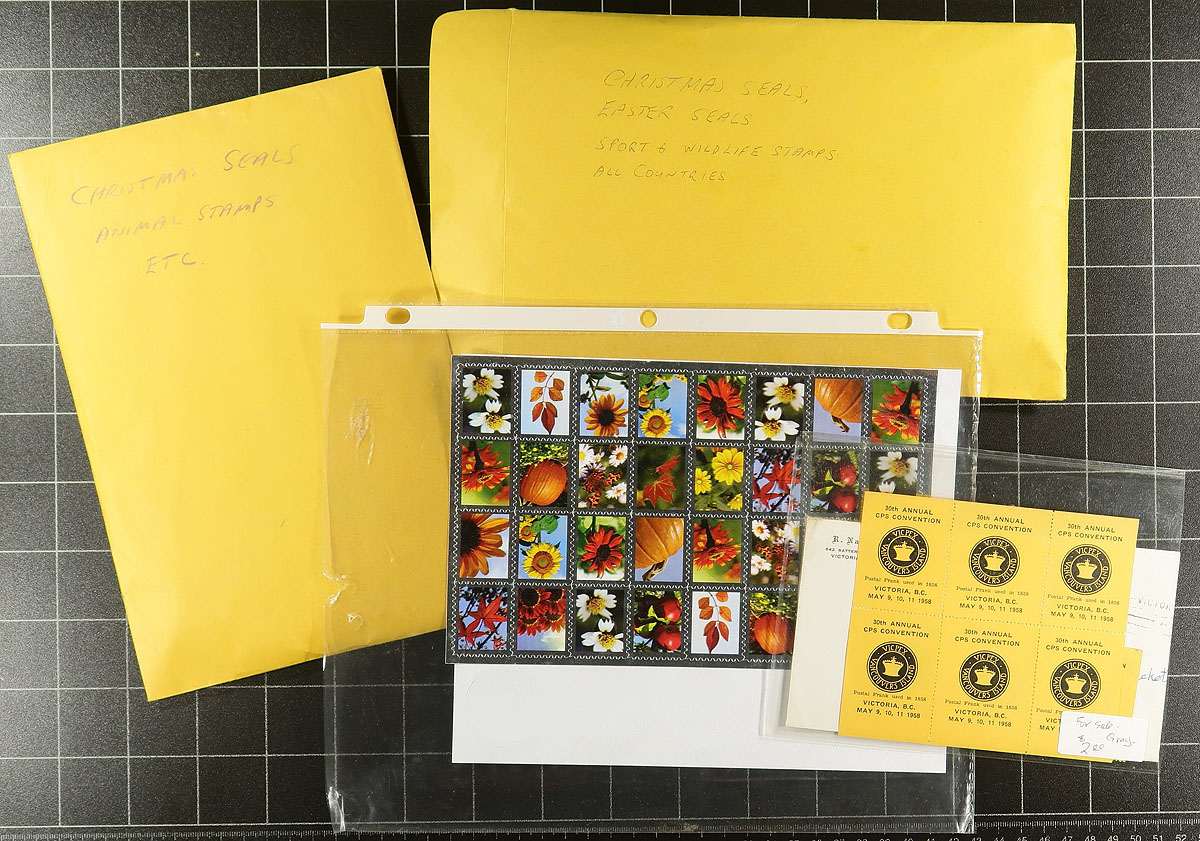 Interesting lot of Canada and United States Christmas Seals, 1950's-1990's, with full sheets, singles, blocks, larger multiples, etc., with probably over 1,000 seals in total. We spotted a few Easter seals as well. A nice accumulation for the Christmas, Seal/Cinderella, topical and thematic collector. Estimate =