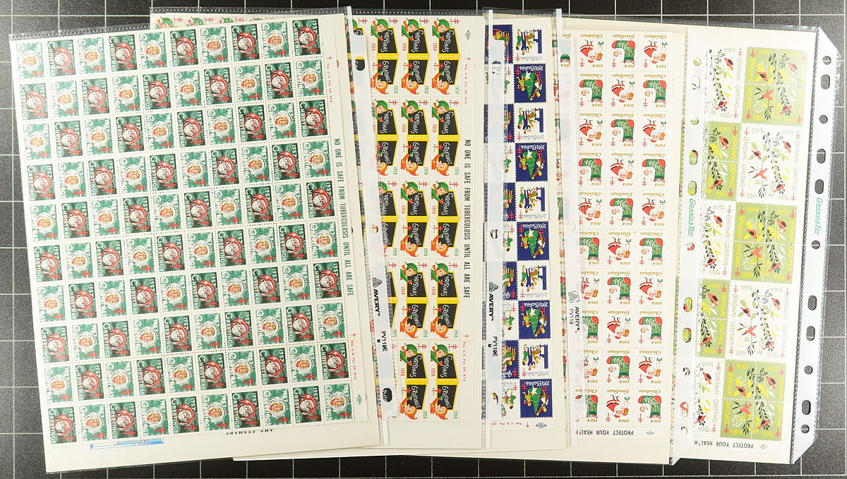 Interesting lot of Canada and United States Christmas Seals, 1950's-1990's, with full sheets, singles, blocks, larger multiples, etc., with probably over 1,000 seals in total. We spotted a few Easter seals as well. A nice accumulation for the Christmas, Seal/Cinderella, topical and thematic collector. Estimate =