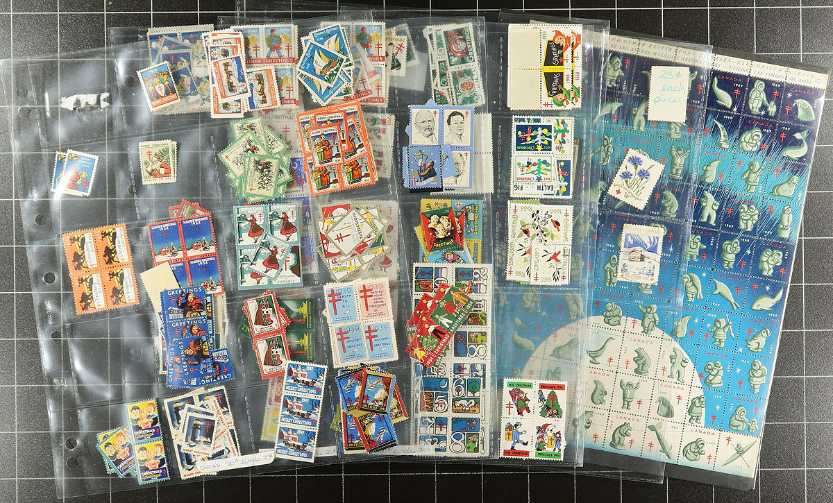 Interesting lot of Canada and United States Christmas Seals, 1950's-1990's, with full sheets, singles, blocks, larger multiples, etc., with probably over 1,000 seals in total. We spotted a few Easter seals as well. A nice accumulation for the Christmas, Seal/Cinderella, topical and thematic collector. Estimate =