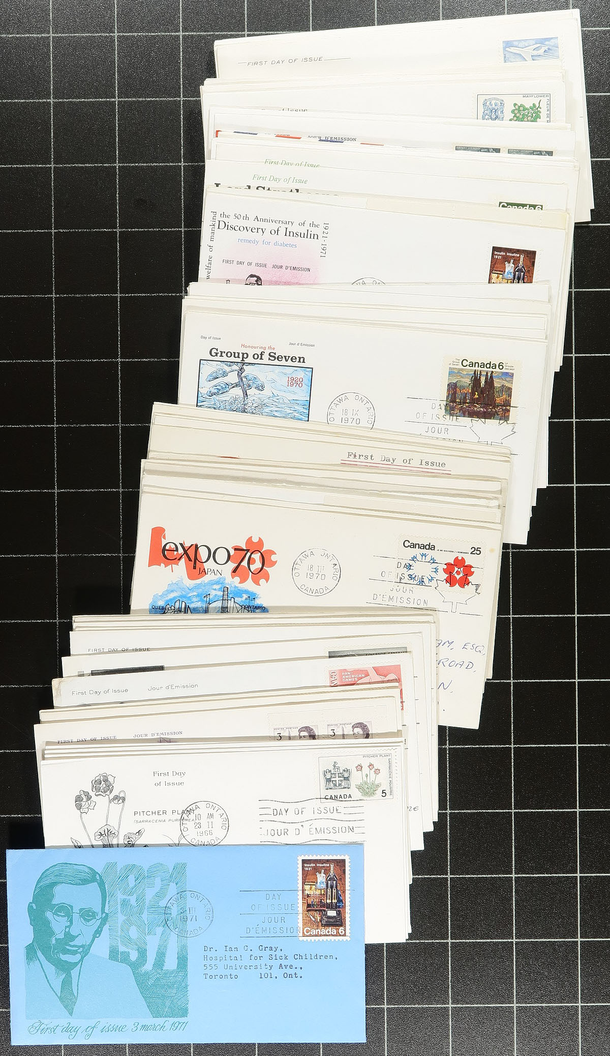 First Day Covers. A nice collection / accumulation of roughly 400 private cachet covers, 1937-1970's, filling a shoe box. We note singles, pairs, and block frankings, with Rosecraft, H&E, Elliott-Marion, and probably more makers found within. Most of the covers to be unaddressed, with some duplication throughout. A nice lot for the collector or dealer. Estimate =