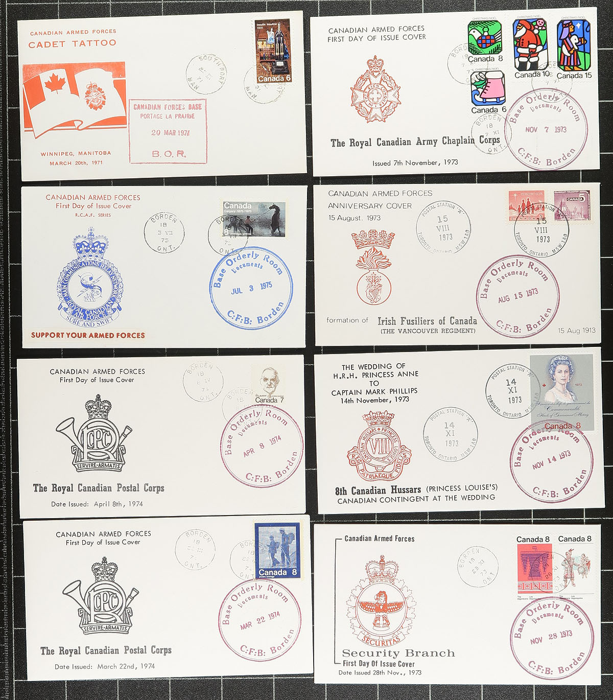 First Day Covers. Interesting group of 33 Canada first day covers, from the Canadian Armed Forces, 1971-1975, with a variety of military themed cachets and camp postmarks, almost all from Base Orderly Room CFB Borden, Ontario, along with a few from Manitoba. A most interesting group that is not normally seen for first day cover collectors, and suitable for military, thematic, and topical collectors as well. Estimate =