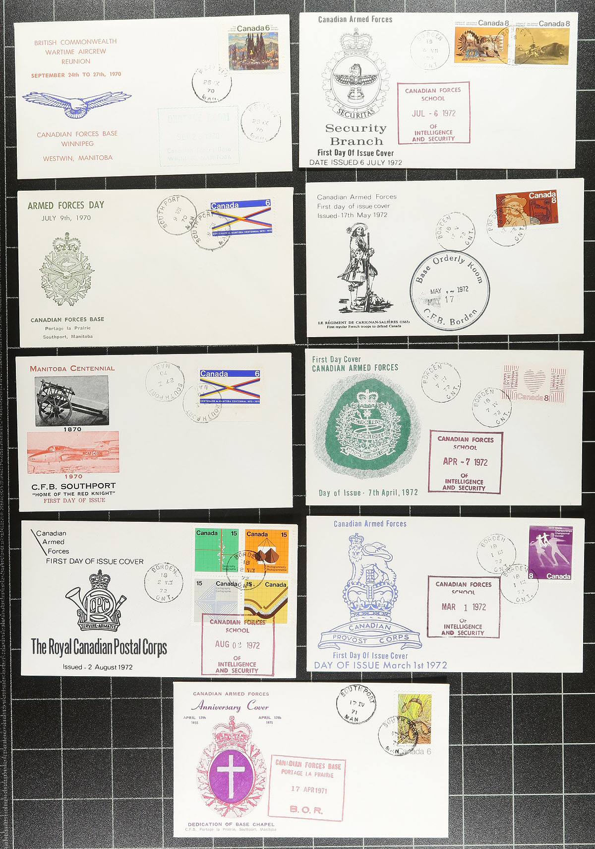 First Day Covers. Interesting group of 33 Canada first day covers, from the Canadian Armed Forces, 1971-1975, with a variety of military themed cachets and camp postmarks, almost all from Base Orderly Room CFB Borden, Ontario, along with a few from Manitoba. A most interesting group that is not normally seen for first day cover collectors, and suitable for military, thematic, and topical collectors as well. Estimate =