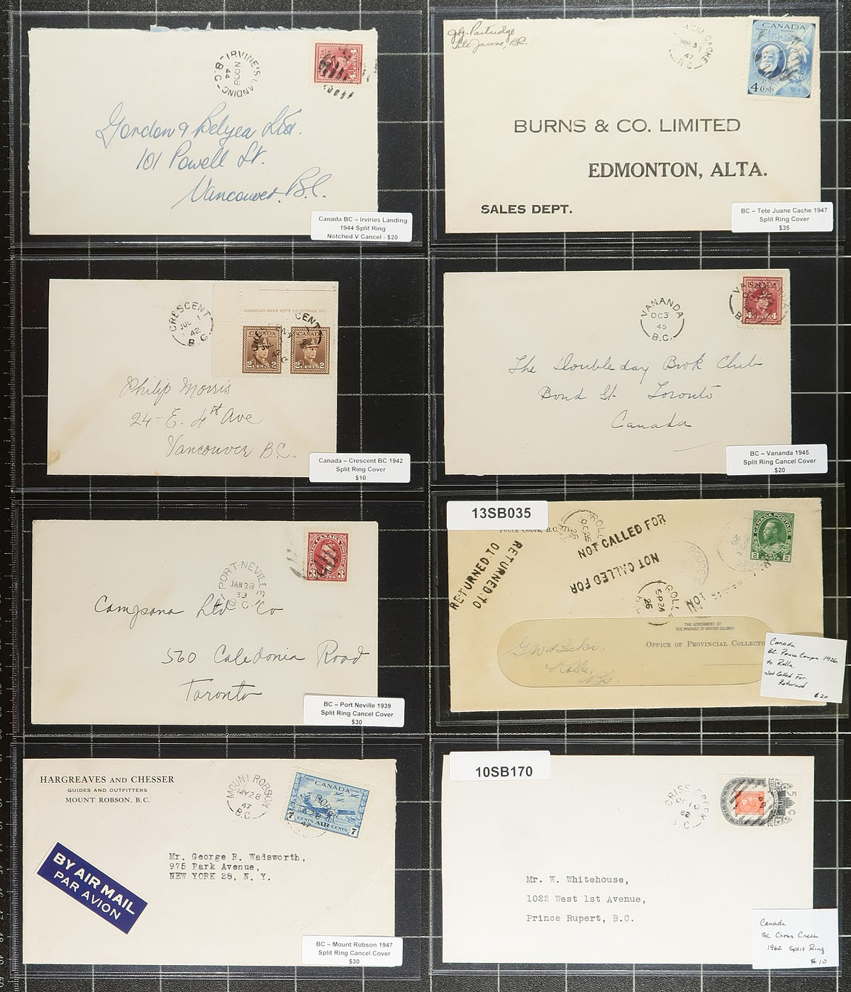 British Columbia Postal History. The BC "two-four", with 24 different split ring postmarks on Edward VII / George V postcards, included closed Post Offices. Towns included are Mayook, Mount Robson, Kimberley, Glacier, MacKinnon, Paterson, Canoe, Pinatan, Grande Prairie, South Hill, Harrison Hot Springs, Halls Prairie, Cadboro Bay, Willow River, Irvines Landing, Crescent, Port Neville, Mount Robson, Tete Juane Cache, Vananda, Rolla, Criss Creek, Fife and Pavilion. Lots of better strikes throughout, perfect for the postmark enthusiast. Each item is individually sleeved and priced. Total retail as marked =