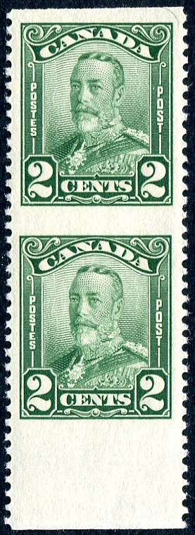 VF mint Never Hinged vertical pair of the 1929 issue 2c green KGV Scroll, imperforate horizontally. Only 250 pairs issued. Post Office fresh, with pristine and unblemished gum. 2024 Unitrade =