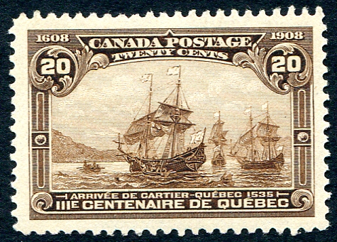 Well centered, VF quality mint Lightly Hinged (almost appearing NH) example of the 1908 issue 20c yellow brown Quebec Tercentenary "Champlain's Arrival" high value. Unitrade is $400.00 for VF mint Hinged. 2025 Scott US$250.00 =