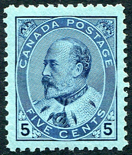 VF mint Lightly Hinged example of the 5c blue on bluish paper 1903 issue Edward. Wonderful colour and as good as it gets for "hinged" gum. 2024 Unitrade for VF MH is $350.00. 2025 Scott US$250.00 =