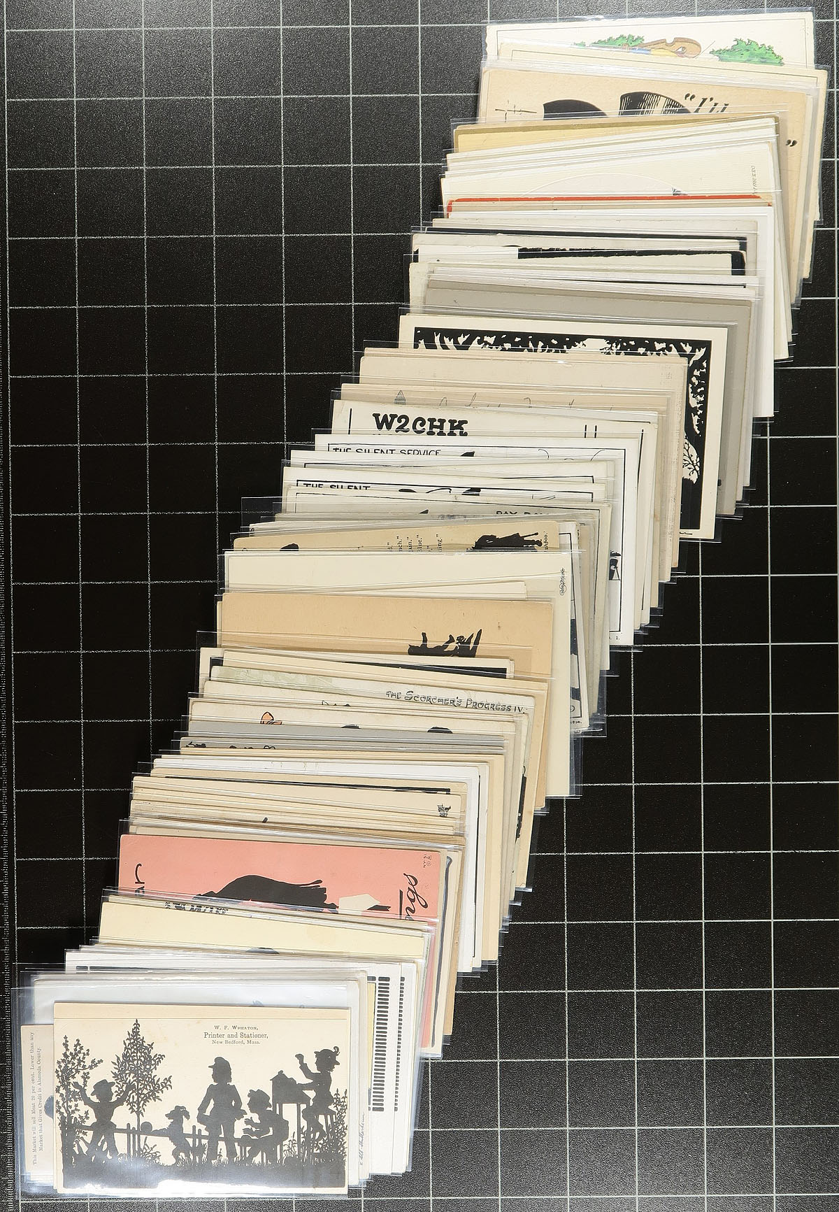 Silhouette Topicals. Wonderful array of 80 postcards, all featuring Silhouette images from primarily USA / eastern Europe. A mix of used / unused with the majority appearing to be pre-1930 postcards. Hard to imagine how long it would take to assemble a group of this quantity, as we have only seen the odd silhouette postcard here and there, so extremely uncommon to see an entire collection focused on this topic. Also included (but not counted) are a few early USA advertising cards featuring silhouettes. A perfect "new collection" for the postcard hound, or fodder for the show/internet dealer. Estimate =