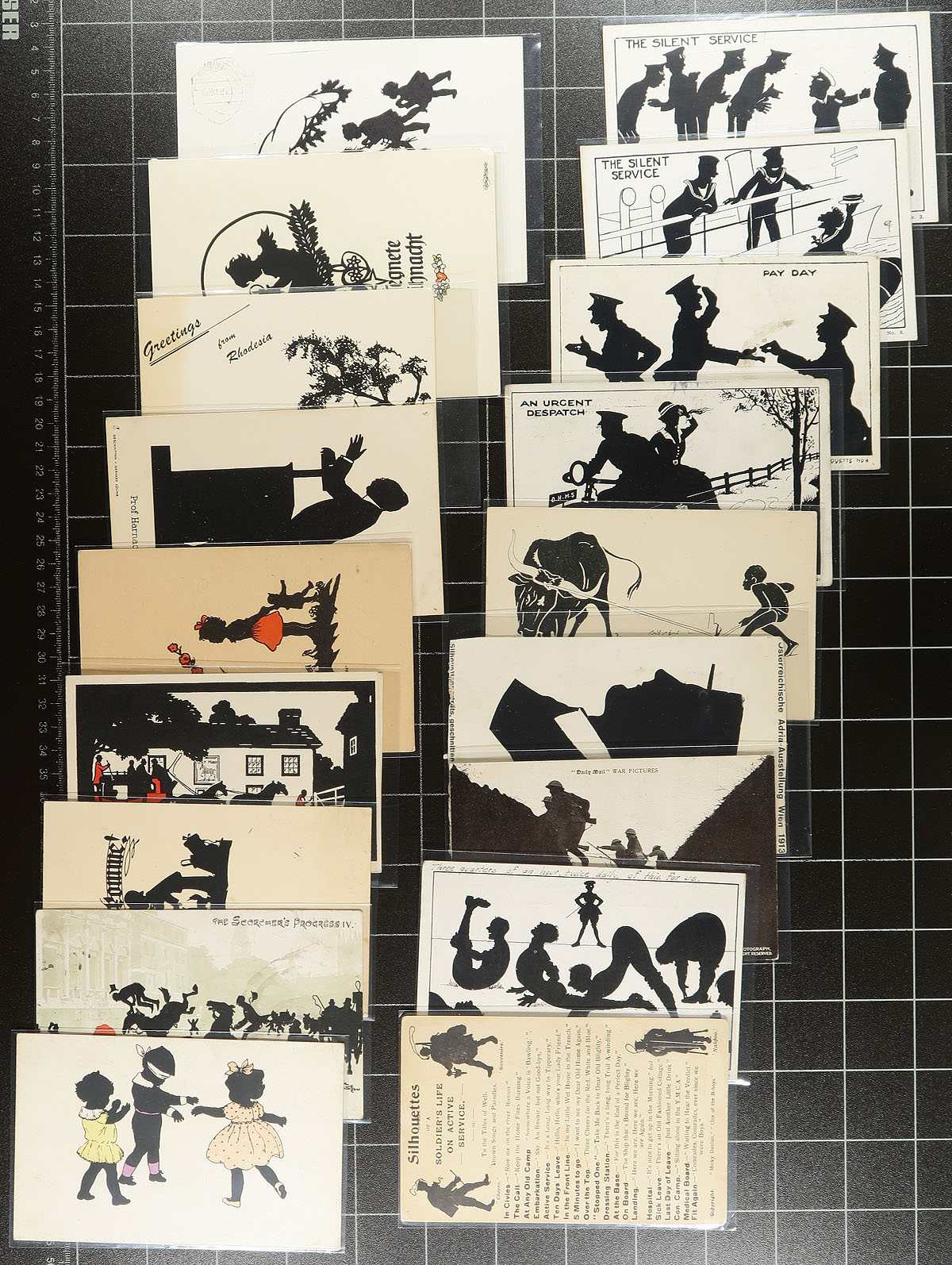 Silhouette Topicals. Wonderful array of 80 postcards, all featuring Silhouette images from primarily USA / eastern Europe. A mix of used / unused with the majority appearing to be pre-1930 postcards. Hard to imagine how long it would take to assemble a group of this quantity, as we have only seen the odd silhouette postcard here and there, so extremely uncommon to see an entire collection focused on this topic. Also included (but not counted) are a few early USA advertising cards featuring silhouettes. A perfect "new collection" for the postcard hound, or fodder for the show/internet dealer. Estimate =