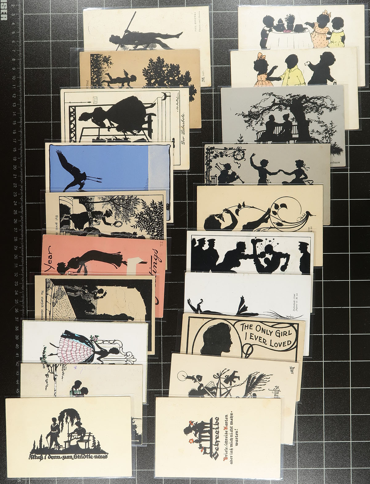 Silhouette Topicals. Wonderful array of 80 postcards, all featuring Silhouette images from primarily USA / eastern Europe. A mix of used / unused with the majority appearing to be pre-1930 postcards. Hard to imagine how long it would take to assemble a group of this quantity, as we have only seen the odd silhouette postcard here and there, so extremely uncommon to see an entire collection focused on this topic. Also included (but not counted) are a few early USA advertising cards featuring silhouettes. A perfect "new collection" for the postcard hound, or fodder for the show/internet dealer. Estimate =