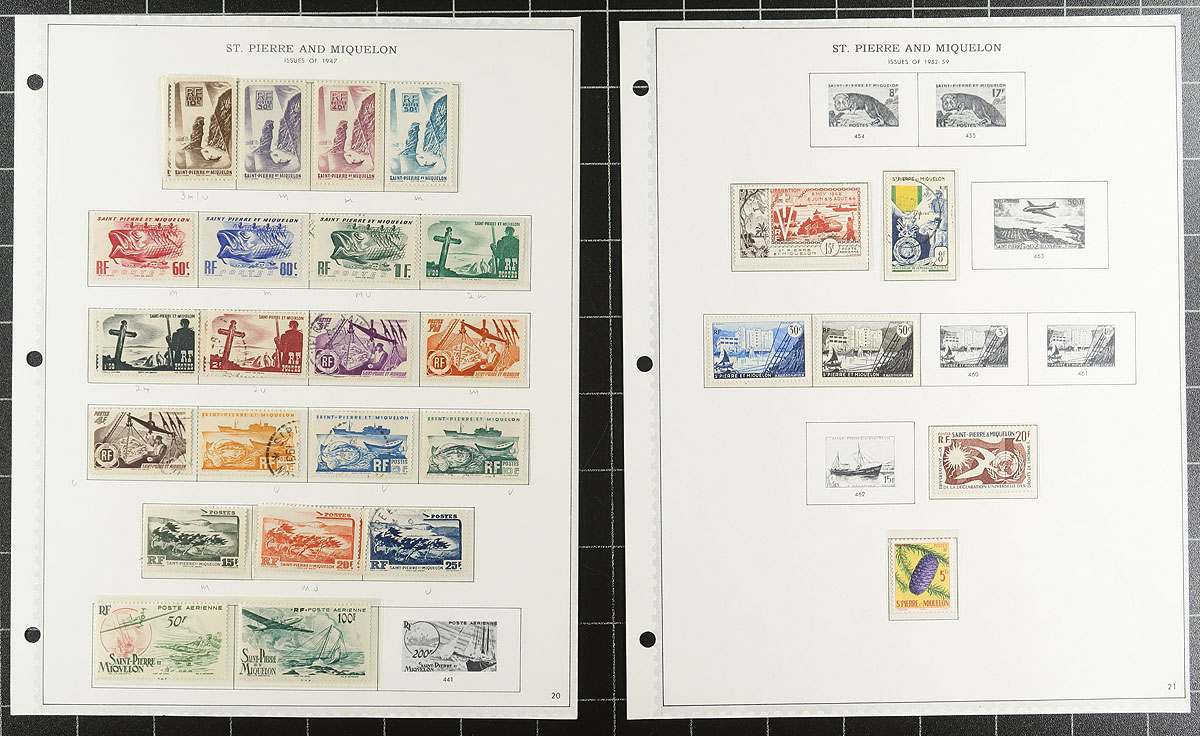 Group of mint and used St. Pierre et Miquelon stamps, containing a few hundred stamps on album pages, stock cards, and stock pages. This nice little group has a bit of everything including a few surcharge stamps, proof, back of the book stamps, and more, with the majority of the material from the 1940's to the 1970's. A spot check indicated a few better items including #223 France Libre (used, c.v. $250), 383-384, C41-C42 (lh, $50 total), and more. A nice lot from this popular collecting area. Owner's older 2014 Scott US$816.00 =