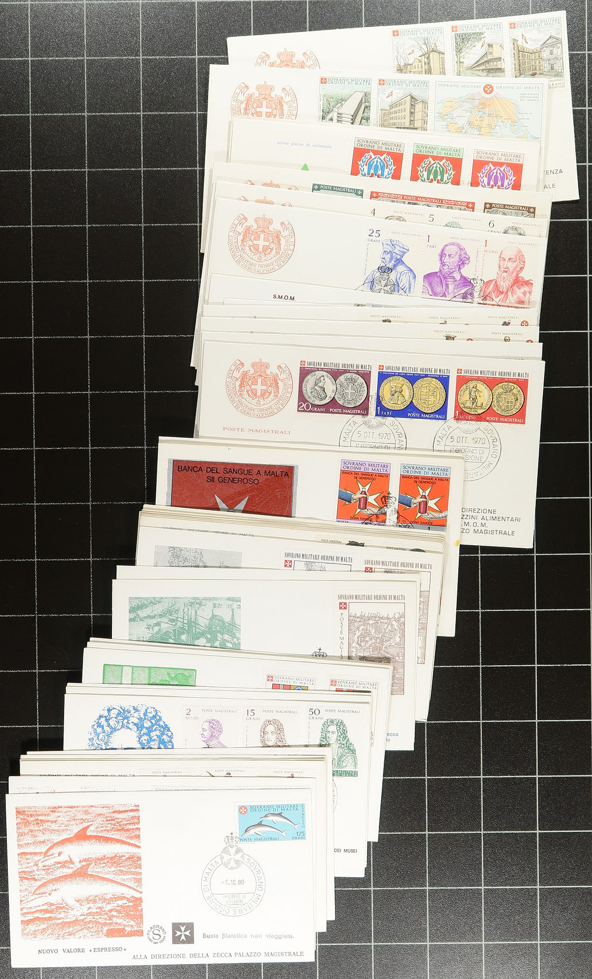 Interesting collection of Sovereign Order of Malta, 1960's-1990's, containing several stamps, roughly 40 souvenir sheets, and 75 first day covers. The majority of material is on roughly 30 well organized homemade pages, beautifully laid out, showing stamp sets, souvenir sheets, and first day covers, from the 1960's to 1979. The lot also include souvenir sheets in stock pages, and loose first day covers. While not recognized by Scott, the stamps are issued for both postal and charitable reasons. Despite over 50 bi-lateral postal agreements the stamps are usually classed as Cinderellas as they do not have postal validity throughout the world. Most postal agreements are with countries in which the order does charitable work. A clean and most interesting lot, ideal for Cinderella, topical and thematic collectors. Estimate =