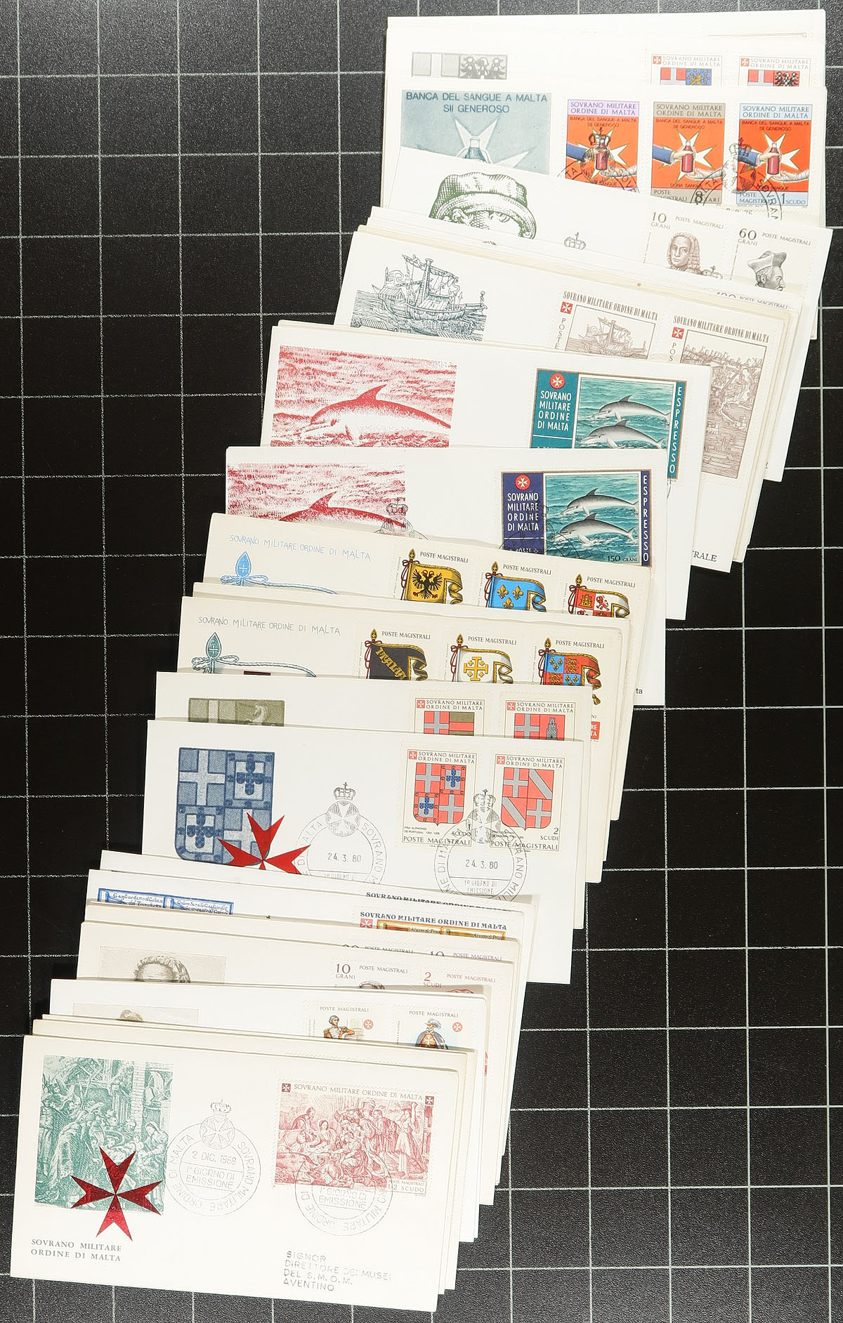 Interesting collection of Sovereign Order of Malta, 1960's-1990's, containing several stamps, roughly 40 souvenir sheets, and 75 first day covers. The majority of material is on roughly 30 well organized homemade pages, beautifully laid out, showing stamp sets, souvenir sheets, and first day covers, from the 1960's to 1979. The lot also include souvenir sheets in stock pages, and loose first day covers. While not recognized by Scott, the stamps are issued for both postal and charitable reasons. Despite over 50 bi-lateral postal agreements the stamps are usually classed as Cinderellas as they do not have postal validity throughout the world. Most postal agreements are with countries in which the order does charitable work. A clean and most interesting lot, ideal for Cinderella, topical and thematic collectors. Estimate =