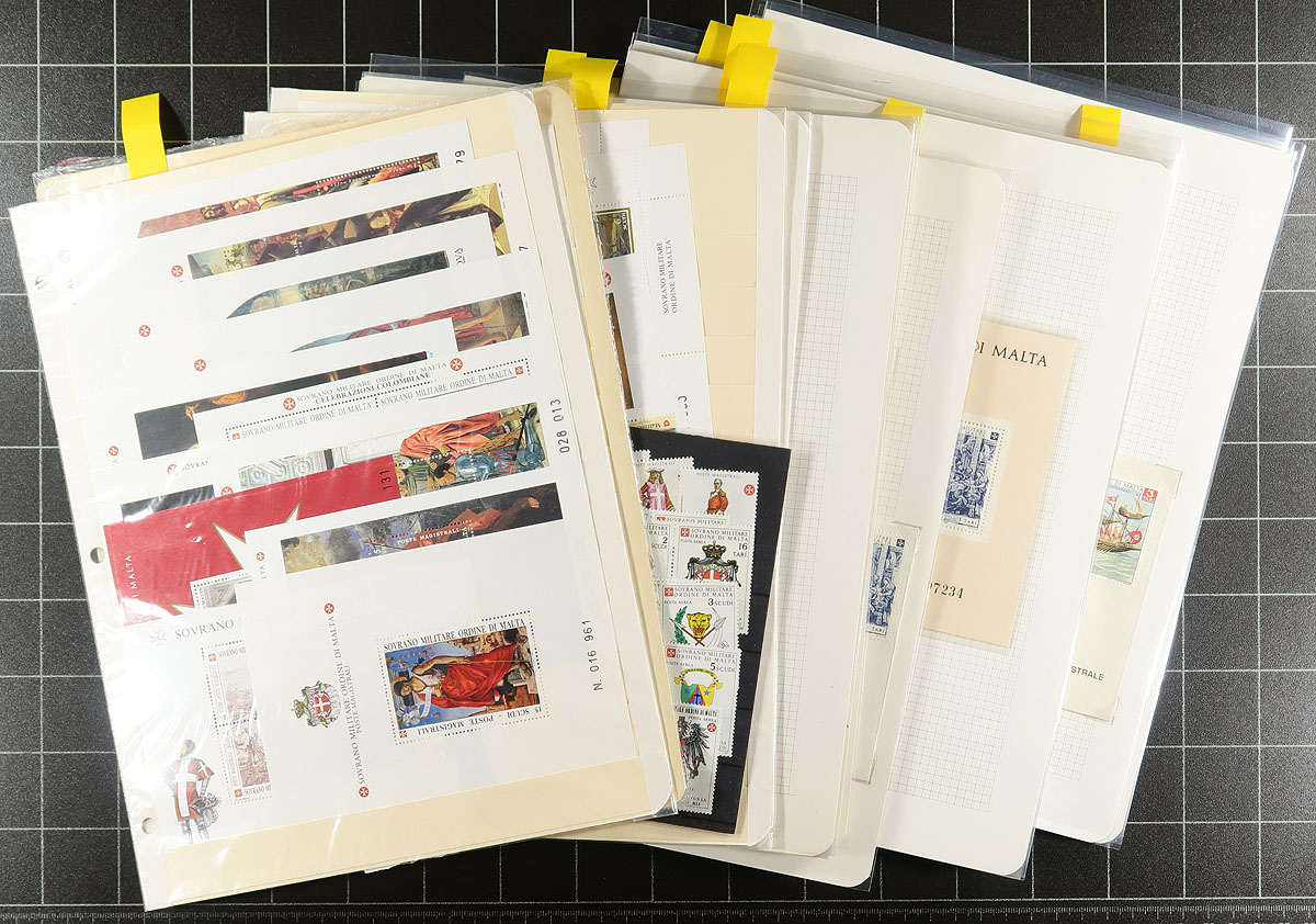 Interesting collection of Sovereign Order of Malta, 1960's-1990's, containing several stamps, roughly 40 souvenir sheets, and 75 first day covers. The majority of material is on roughly 30 well organized homemade pages, beautifully laid out, showing stamp sets, souvenir sheets, and first day covers, from the 1960's to 1979. The lot also include souvenir sheets in stock pages, and loose first day covers. While not recognized by Scott, the stamps are issued for both postal and charitable reasons. Despite over 50 bi-lateral postal agreements the stamps are usually classed as Cinderellas as they do not have postal validity throughout the world. Most postal agreements are with countries in which the order does charitable work. A clean and most interesting lot, ideal for Cinderella, topical and thematic collectors. Estimate =