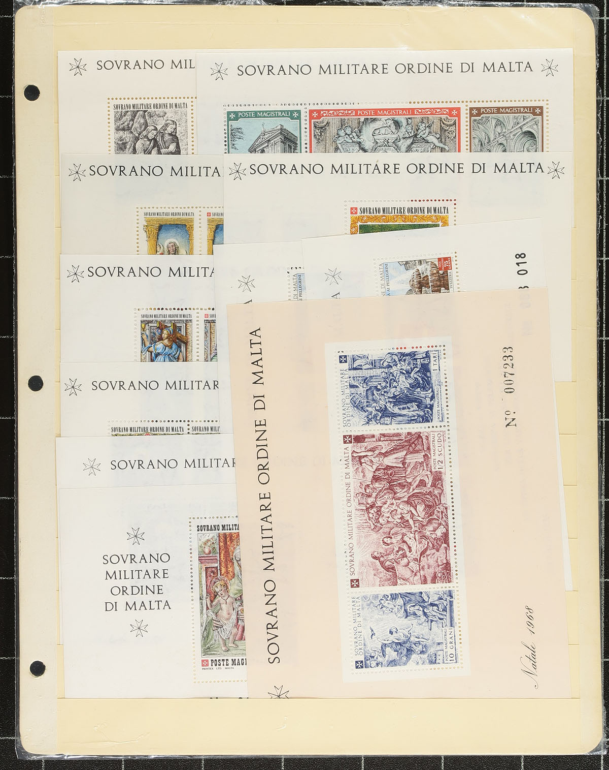 Interesting collection of Sovereign Order of Malta, 1960's-1990's, containing several stamps, roughly 40 souvenir sheets, and 75 first day covers. The majority of material is on roughly 30 well organized homemade pages, beautifully laid out, showing stamp sets, souvenir sheets, and first day covers, from the 1960's to 1979. The lot also include souvenir sheets in stock pages, and loose first day covers. While not recognized by Scott, the stamps are issued for both postal and charitable reasons. Despite over 50 bi-lateral postal agreements the stamps are usually classed as Cinderellas as they do not have postal validity throughout the world. Most postal agreements are with countries in which the order does charitable work. A clean and most interesting lot, ideal for Cinderella, topical and thematic collectors. Estimate =