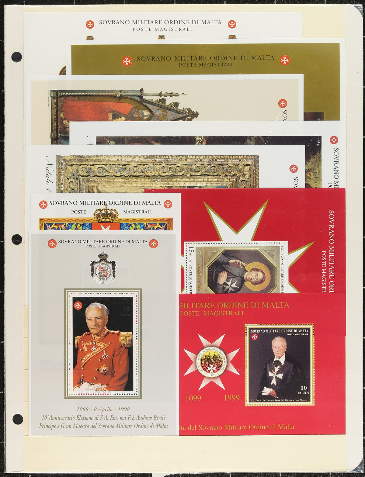 Interesting collection of Sovereign Order of Malta, 1960's-1990's, containing several stamps, roughly 40 souvenir sheets, and 75 first day covers. The majority of material is on roughly 30 well organized homemade pages, beautifully laid out, showing stamp sets, souvenir sheets, and first day covers, from the 1960's to 1979. The lot also include souvenir sheets in stock pages, and loose first day covers. While not recognized by Scott, the stamps are issued for both postal and charitable reasons. Despite over 50 bi-lateral postal agreements the stamps are usually classed as Cinderellas as they do not have postal validity throughout the world. Most postal agreements are with countries in which the order does charitable work. A clean and most interesting lot, ideal for Cinderella, topical and thematic collectors. Estimate =