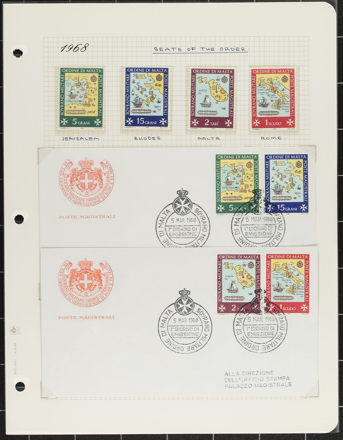 Interesting collection of Sovereign Order of Malta, 1960's-1990's, containing several stamps, roughly 40 souvenir sheets, and 75 first day covers. The majority of material is on roughly 30 well organized homemade pages, beautifully laid out, showing stamp sets, souvenir sheets, and first day covers, from the 1960's to 1979. The lot also include souvenir sheets in stock pages, and loose first day covers. While not recognized by Scott, the stamps are issued for both postal and charitable reasons. Despite over 50 bi-lateral postal agreements the stamps are usually classed as Cinderellas as they do not have postal validity throughout the world. Most postal agreements are with countries in which the order does charitable work. A clean and most interesting lot, ideal for Cinderella, topical and thematic collectors. Estimate =