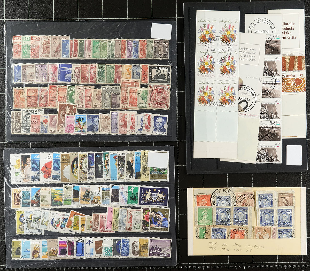 Collection / accumulation of used Australia, containing roughly 1,400 stamps in over 20 stock pages. Most of the pages are well organized by Scott numbers, noting a handful of Kangaroos, KGV Heads, back of the book material, and more, with material generally ranging from the 1910's to the 1980's. A very interesting assembly, with potential better finds for the dedicated collector. Postmark interest includes cds, ship mail, late fee, and other postmark types, including some "socked on the nose" town cancels. A nice lot for all collectors. 2024 Scott US$2,242.00 =