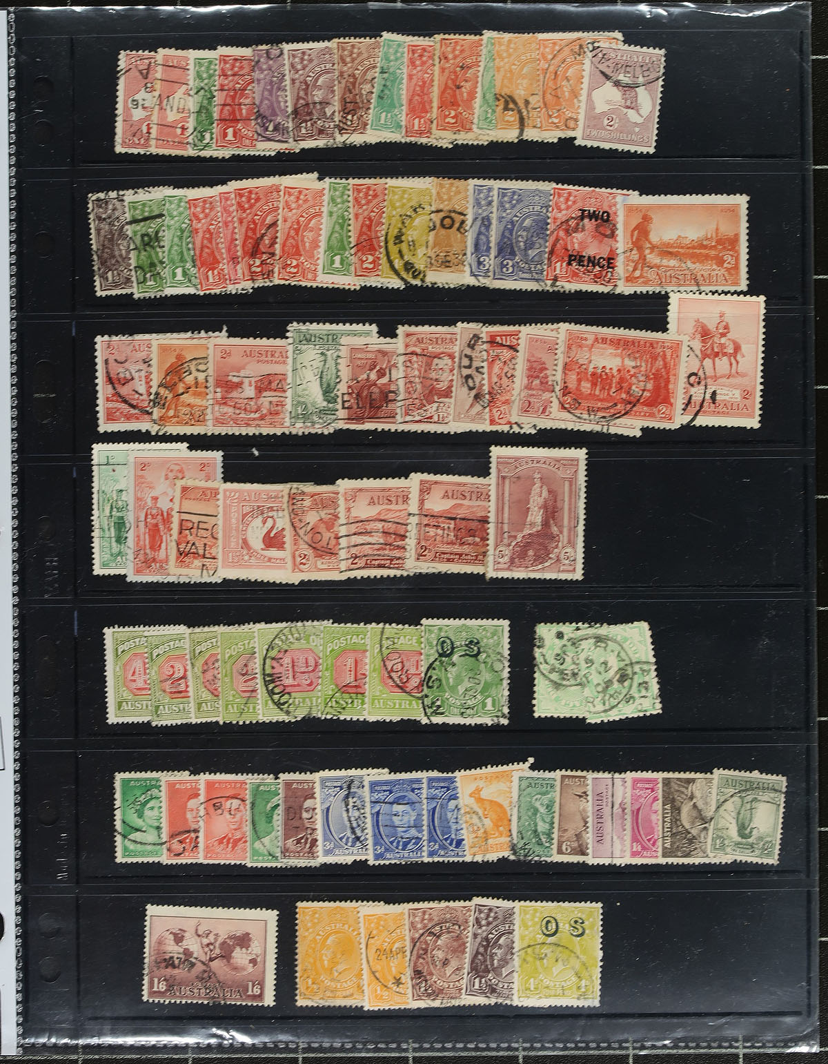 Collection / accumulation of used Australia, containing roughly 1,400 stamps in over 20 stock pages. Most of the pages are well organized by Scott numbers, noting a handful of Kangaroos, KGV Heads, back of the book material, and more, with material generally ranging from the 1910's to the 1980's. A very interesting assembly, with potential better finds for the dedicated collector. Postmark interest includes cds, ship mail, late fee, and other postmark types, including some "socked on the nose" town cancels. A nice lot for all collectors. 2024 Scott US$2,242.00 =