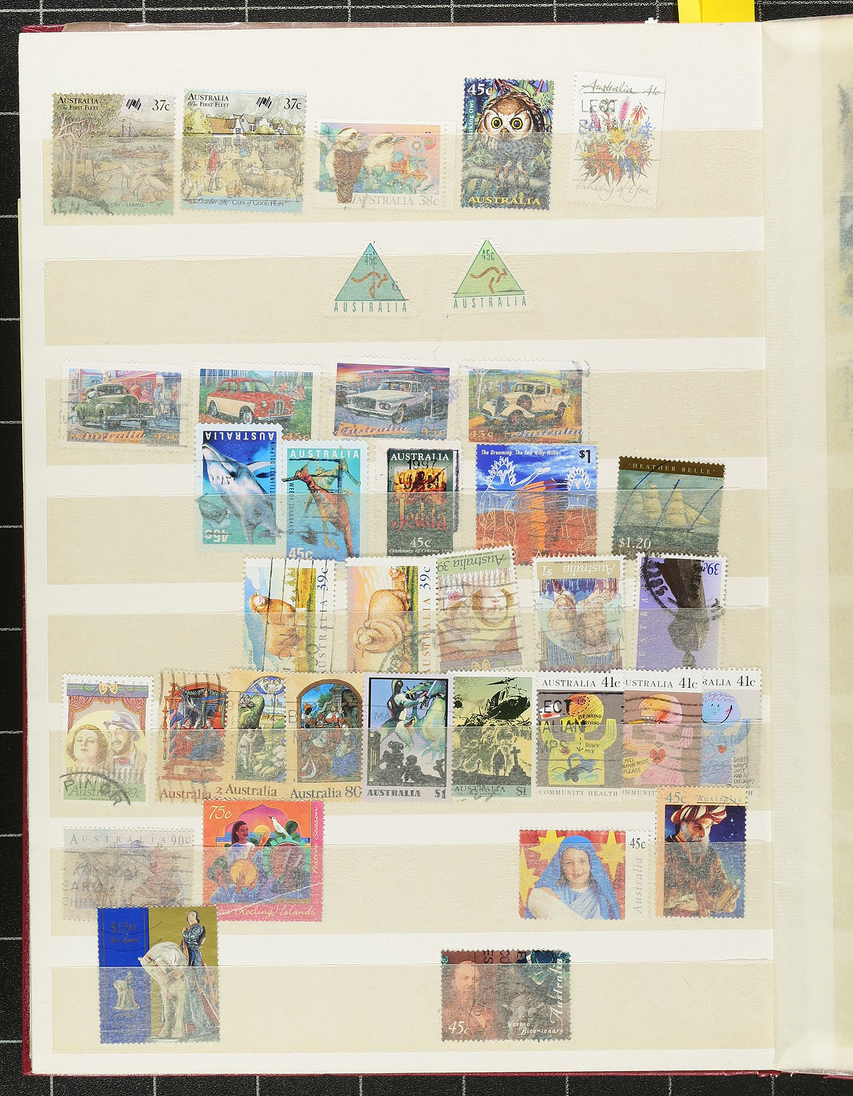 Accumulation of used Australia, 1910's-1990's, with roughly 1,700 stamps in a stockbook and in roughly 25 manila stock pages in a binder. The lot contains a small selection of Kangaroos and KGV Heads, with the majority of material from the 1920's to the 1970's, including some "back of the book" issues. A nice starter lot or for the worldwide collector looking to fill gaps. Duplication ranges from 1 to 3 for some issues, overall fine to very fine. Estimate =