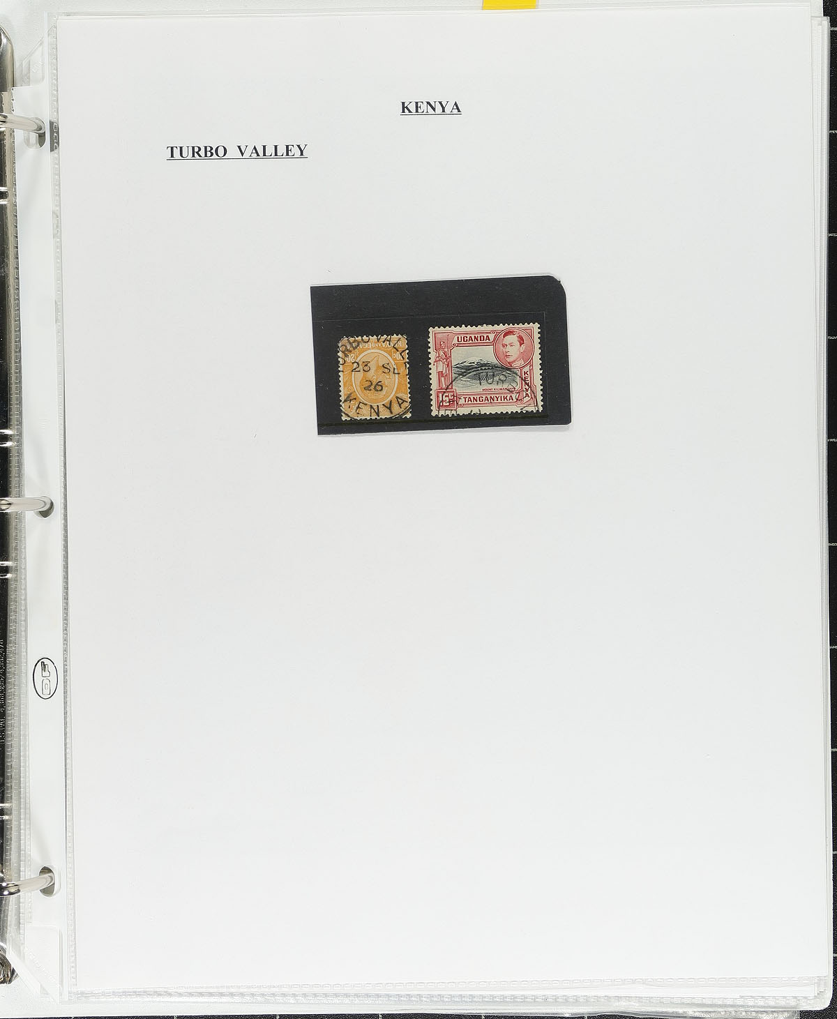 Lovely collection of Kenya collected for town postmarks, 1930's-1970's, containing many hundreds of stamps and roughly 35 covers, in over 45 well described pages. The lot contains representation from over 50 different towns (represented by at least one stamp), ranging from towns ranging from N to Y. Some of the towns encountered include Nanyuki, Nyahururu, Sotik, Thika, Turbo Valley, and more. Postmarks include cds, registered, and postage paid cancels to name a few. A nice lot for the postmark collector, overall fine to very fine. Estimate =