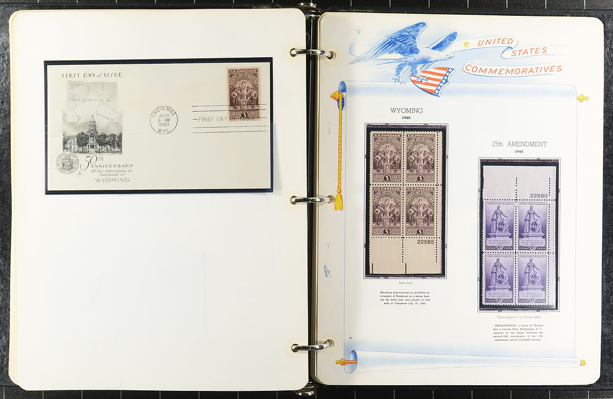 Clean collection of United States never hinged plate blocks and first day covers, 1938-1952, in roughly 100 White Ace album pages housed in 2 binders. The collection ranges from Scott #799/1016, including 1940 Famous Americans sets, along with a few airmail issues. The collection also includes roughly 100 first day covers in hingeless mounts on opposite pages. A nice clean lot that should be expanded. Owner's older 2006 Scott US Specialized US$1,030.00 =