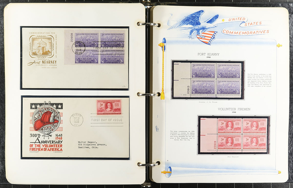 Clean collection of United States never hinged plate blocks and first day covers, 1938-1952, in roughly 100 White Ace album pages housed in 2 binders. The collection ranges from Scott #799/1016, including 1940 Famous Americans sets, along with a few airmail issues. The collection also includes roughly 100 first day covers in hingeless mounts on opposite pages. A nice clean lot that should be expanded. Owner's older 2006 Scott US Specialized US$1,030.00 =