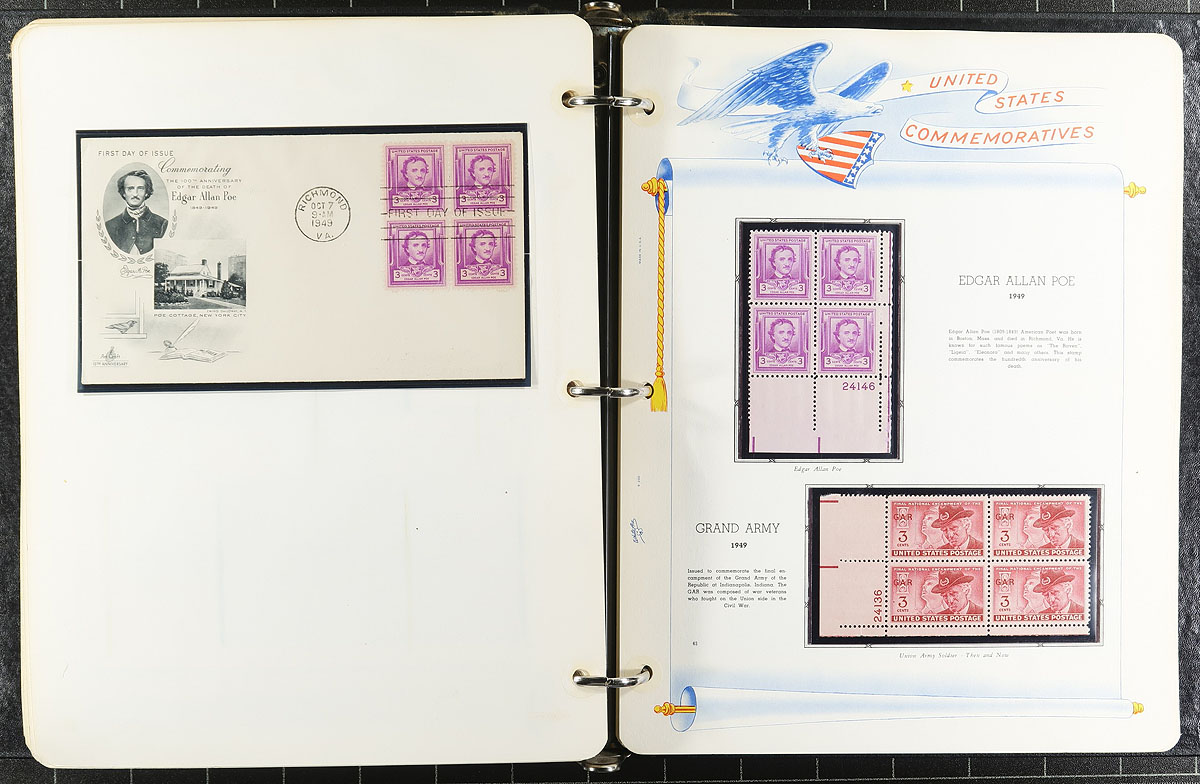 Clean collection of United States never hinged plate blocks and first day covers, 1938-1952, in roughly 100 White Ace album pages housed in 2 binders. The collection ranges from Scott #799/1016, including 1940 Famous Americans sets, along with a few airmail issues. The collection also includes roughly 100 first day covers in hingeless mounts on opposite pages. A nice clean lot that should be expanded. Owner's older 2006 Scott US Specialized US$1,030.00 =