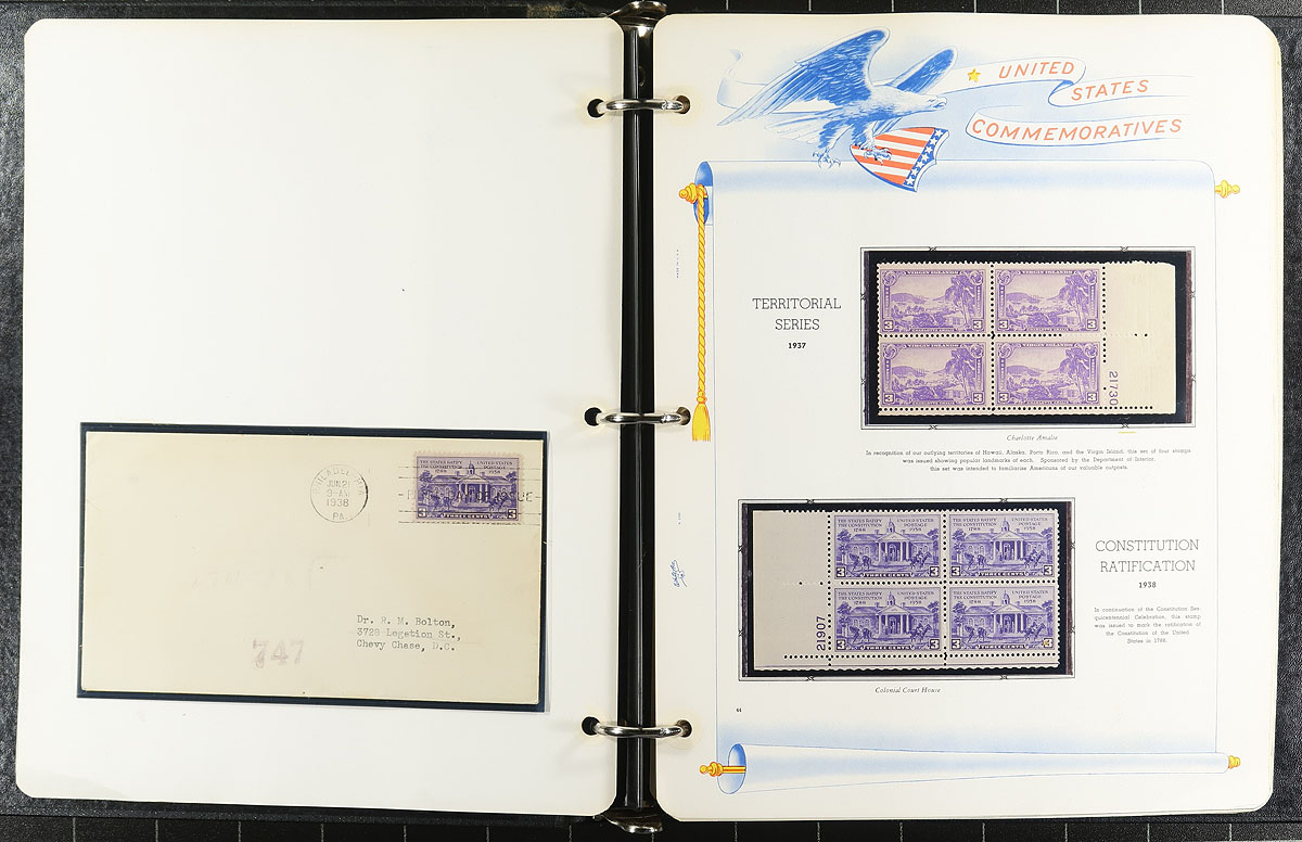 Clean collection of United States never hinged plate blocks and first day covers, 1938-1952, in roughly 100 White Ace album pages housed in 2 binders. The collection ranges from Scott #799/1016, including 1940 Famous Americans sets, along with a few airmail issues. The collection also includes roughly 100 first day covers in hingeless mounts on opposite pages. A nice clean lot that should be expanded. Owner's older 2006 Scott US Specialized US$1,030.00 =