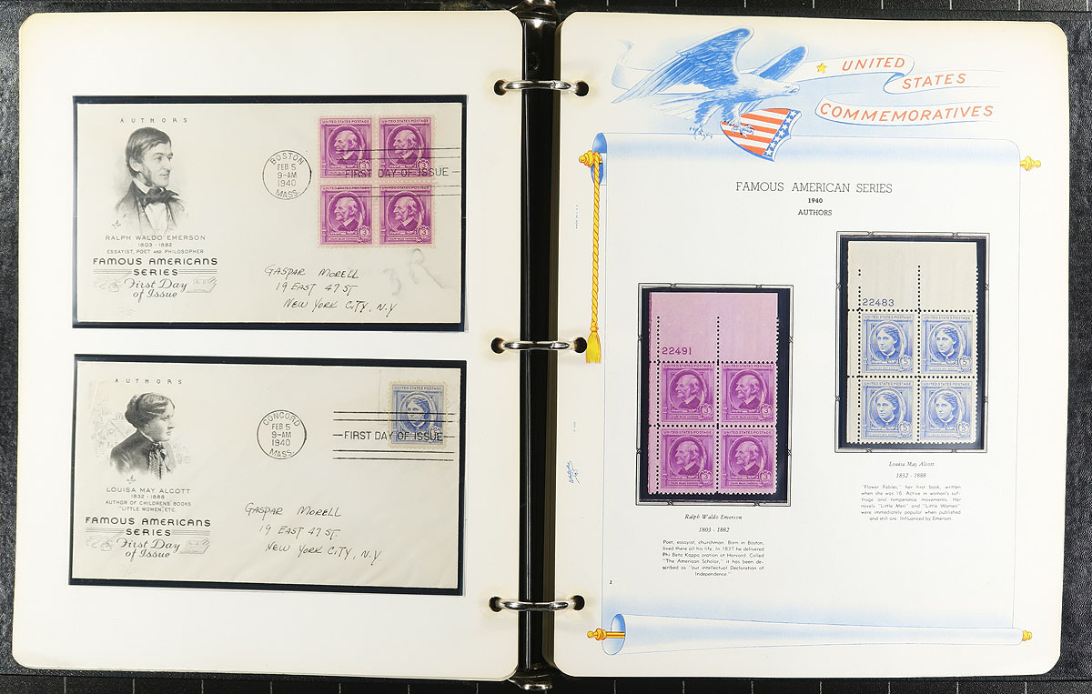 Clean collection of United States never hinged plate blocks and first day covers, 1938-1952, in roughly 100 White Ace album pages housed in 2 binders. The collection ranges from Scott #799/1016, including 1940 Famous Americans sets, along with a few airmail issues. The collection also includes roughly 100 first day covers in hingeless mounts on opposite pages. A nice clean lot that should be expanded. Owner's older 2006 Scott US Specialized US$1,030.00 =