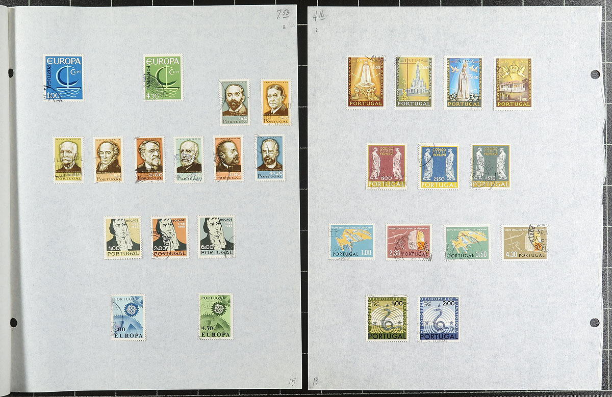 Collection / accumulation of used Portugal, 1860's-2000, containing roughly 1,500 stamps in over 20 album or stock pages. This fairly organized lot generally ranges from Scott #14/2341, along with selection of back of the book and a few Colonies stamps, noting a few singles and sets cataloguing in the $10 to $25 and up range. Postmark interest includes oval, cds, etc, including some "socked on the nose" town cancels. A nice lot from this often under-appreciated collecting area. Owner's older 2013 Scott US$1,473.00 =