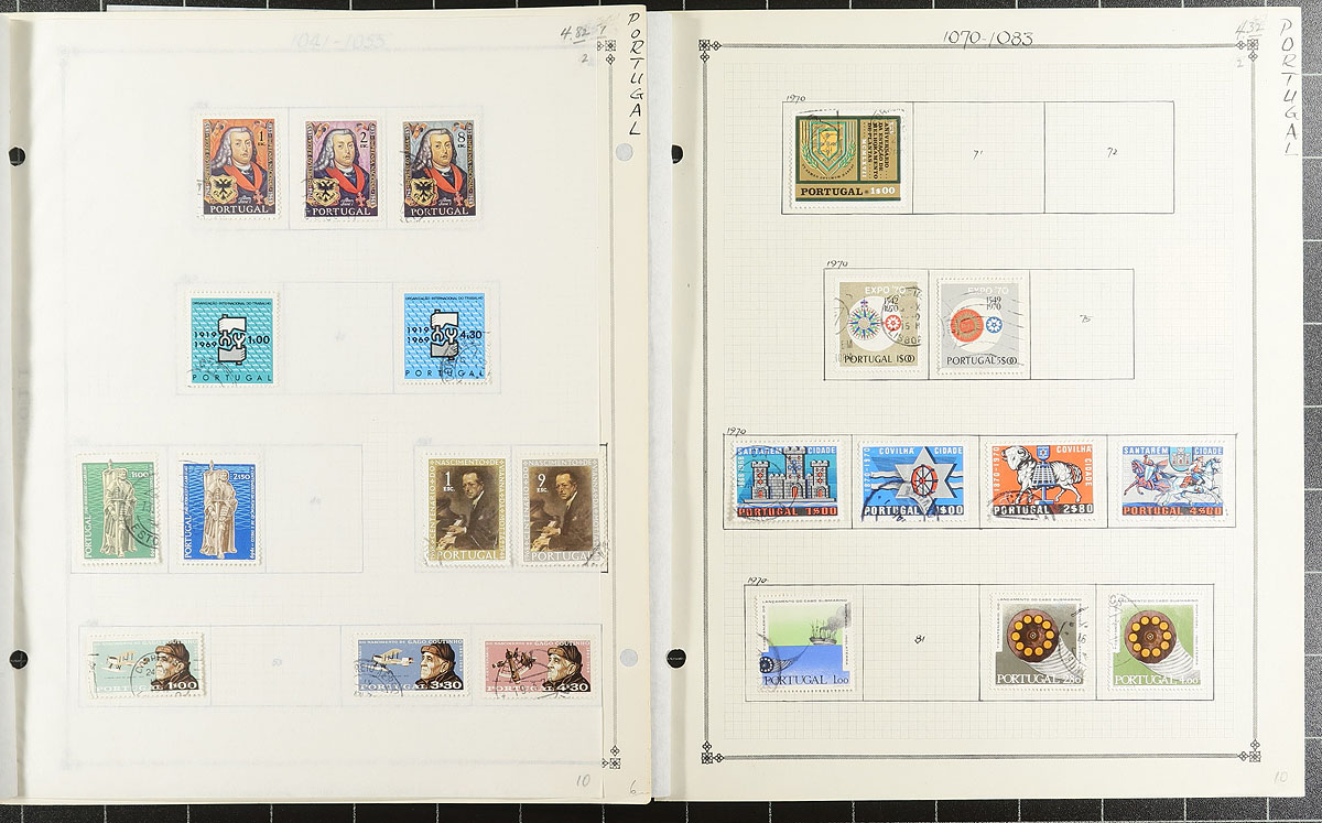 Collection / accumulation of used Portugal, 1860's-2000, containing roughly 1,500 stamps in over 20 album or stock pages. This fairly organized lot generally ranges from Scott #14/2341, along with selection of back of the book and a few Colonies stamps, noting a few singles and sets cataloguing in the $10 to $25 and up range. Postmark interest includes oval, cds, etc, including some "socked on the nose" town cancels. A nice lot from this often under-appreciated collecting area. Owner's older 2013 Scott US$1,473.00 =