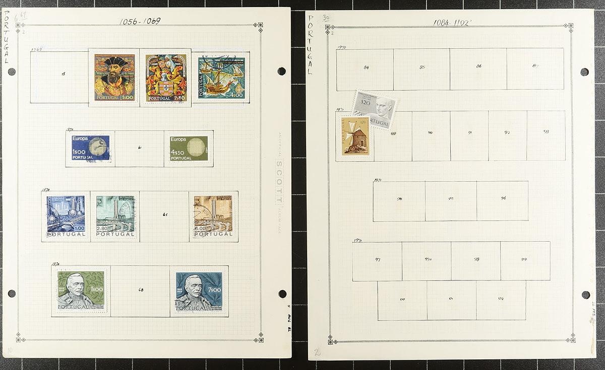 Collection / accumulation of used Portugal, 1860's-2000, containing roughly 1,500 stamps in over 20 album or stock pages. This fairly organized lot generally ranges from Scott #14/2341, along with selection of back of the book and a few Colonies stamps, noting a few singles and sets cataloguing in the $10 to $25 and up range. Postmark interest includes oval, cds, etc, including some "socked on the nose" town cancels. A nice lot from this often under-appreciated collecting area. Owner's older 2013 Scott US$1,473.00 =