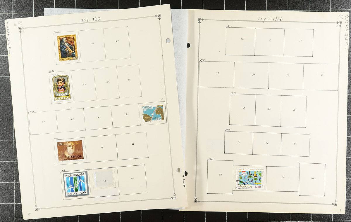 Collection / accumulation of used Portugal, 1860's-2000, containing roughly 1,500 stamps in over 20 album or stock pages. This fairly organized lot generally ranges from Scott #14/2341, along with selection of back of the book and a few Colonies stamps, noting a few singles and sets cataloguing in the $10 to $25 and up range. Postmark interest includes oval, cds, etc, including some "socked on the nose" town cancels. A nice lot from this often under-appreciated collecting area. Owner's older 2013 Scott US$1,473.00 =