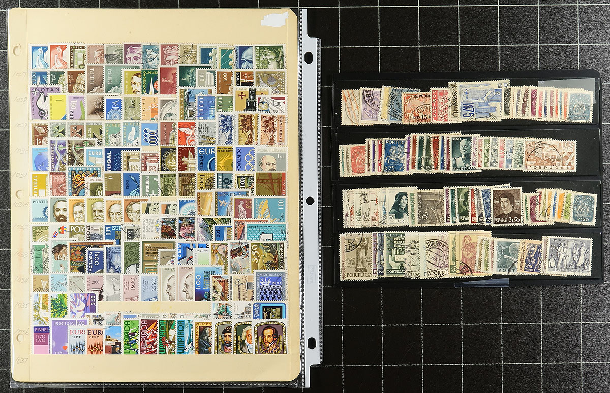 Collection / accumulation of used Portugal, 1860's-2000, containing roughly 1,500 stamps in over 20 album or stock pages. This fairly organized lot generally ranges from Scott #14/2341, along with selection of back of the book and a few Colonies stamps, noting a few singles and sets cataloguing in the $10 to $25 and up range. Postmark interest includes oval, cds, etc, including some "socked on the nose" town cancels. A nice lot from this often under-appreciated collecting area. Owner's older 2013 Scott US$1,473.00 =