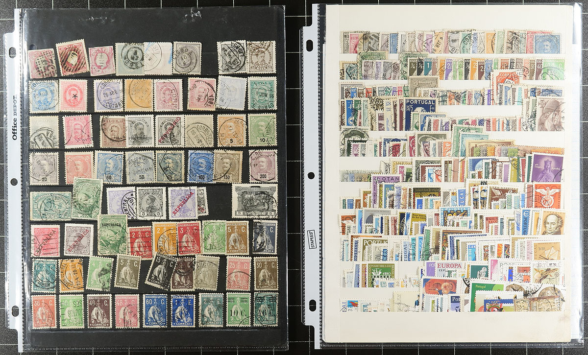 Collection / accumulation of used Portugal, 1860's-2000, containing roughly 1,500 stamps in over 20 album or stock pages. This fairly organized lot generally ranges from Scott #14/2341, along with selection of back of the book and a few Colonies stamps, noting a few singles and sets cataloguing in the $10 to $25 and up range. Postmark interest includes oval, cds, etc, including some "socked on the nose" town cancels. A nice lot from this often under-appreciated collecting area. Owner's older 2013 Scott US$1,473.00 =