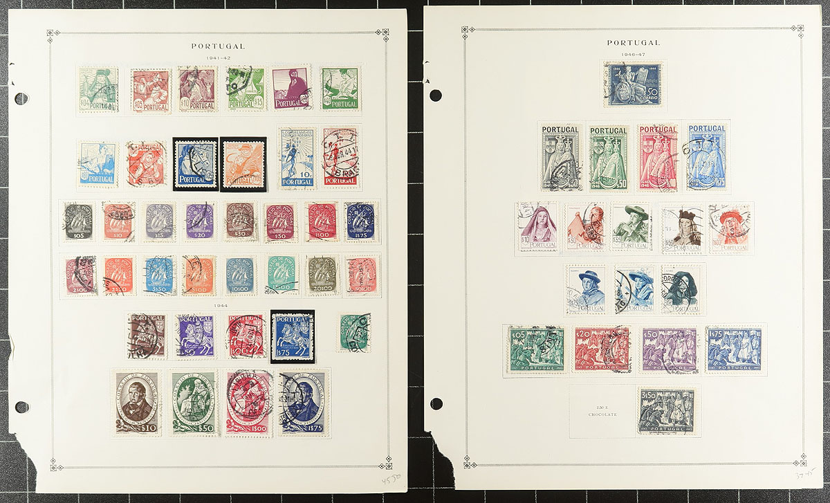 Collection / accumulation of used Portugal, 1860's-2000, containing roughly 1,500 stamps in over 20 album or stock pages. This fairly organized lot generally ranges from Scott #14/2341, along with selection of back of the book and a few Colonies stamps, noting a few singles and sets cataloguing in the $10 to $25 and up range. Postmark interest includes oval, cds, etc, including some "socked on the nose" town cancels. A nice lot from this often under-appreciated collecting area. Owner's older 2013 Scott US$1,473.00 =