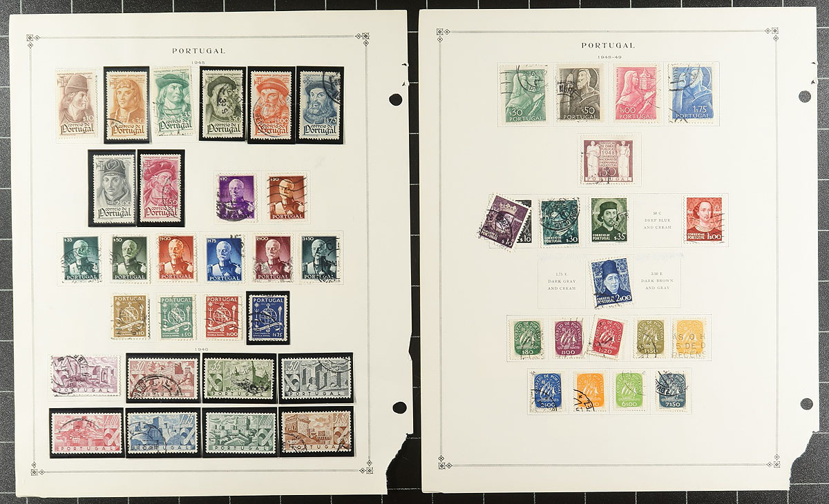 Collection / accumulation of used Portugal, 1860's-2000, containing roughly 1,500 stamps in over 20 album or stock pages. This fairly organized lot generally ranges from Scott #14/2341, along with selection of back of the book and a few Colonies stamps, noting a few singles and sets cataloguing in the $10 to $25 and up range. Postmark interest includes oval, cds, etc, including some "socked on the nose" town cancels. A nice lot from this often under-appreciated collecting area. Owner's older 2013 Scott US$1,473.00 =