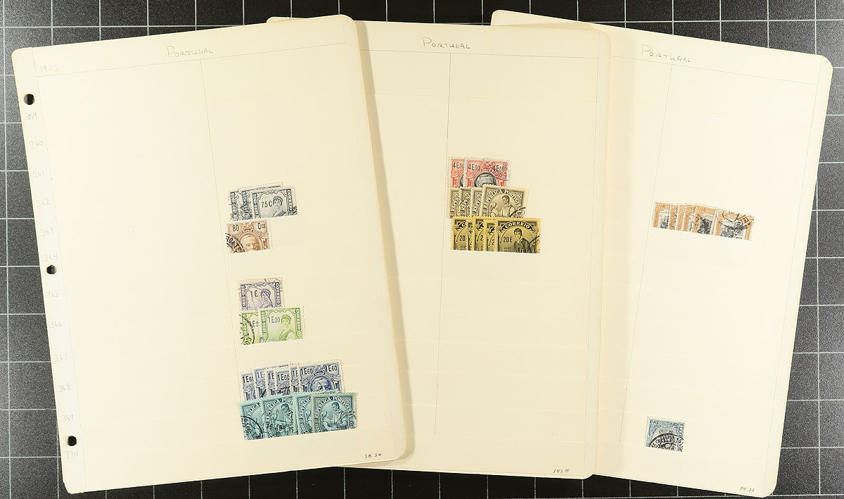 Stock of primarily used Portugal, 1850's-1970's, containing a few thousand stamps in over 40 manila stock pages and in several 102 cards. A spot check indicates a small selection of early issues with the majority of material ranging from the late 19th century up to the 1940's, with a few items cataloguing in the $5 to $10 range, leaving better finds to the dedicated collector, including town postmarks. Overall fine to very fine. Estimate =