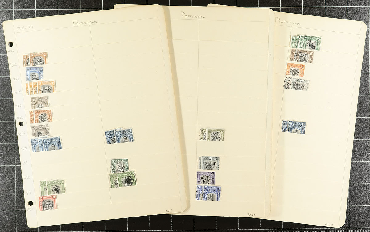 Stock of primarily used Portugal, 1850's-1970's, containing a few thousand stamps in over 40 manila stock pages and in several 102 cards. A spot check indicates a small selection of early issues with the majority of material ranging from the late 19th century up to the 1940's, with a few items cataloguing in the $5 to $10 range, leaving better finds to the dedicated collector, including town postmarks. Overall fine to very fine. Estimate =
